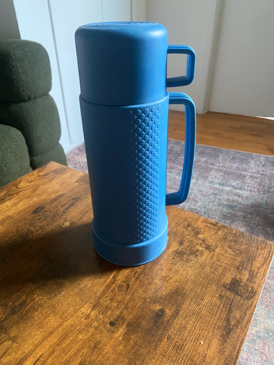 Selling a blue thermos! It's in good condition and ready to keep your drinks hot or cold. It has a unique design and a convenient handle for easy carrying