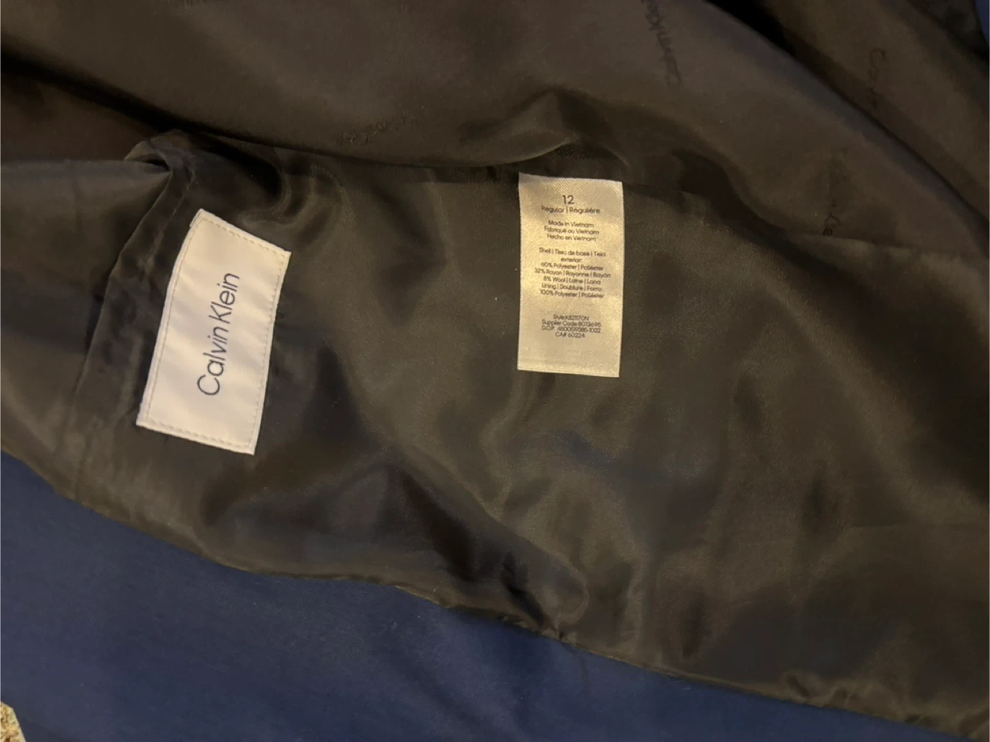 Selling a Calvin Klein blue suit in size 12. The suit is made of 62% polyester, 32% rayon, and 6% wool. It's in great condition and ready for a new owner!
