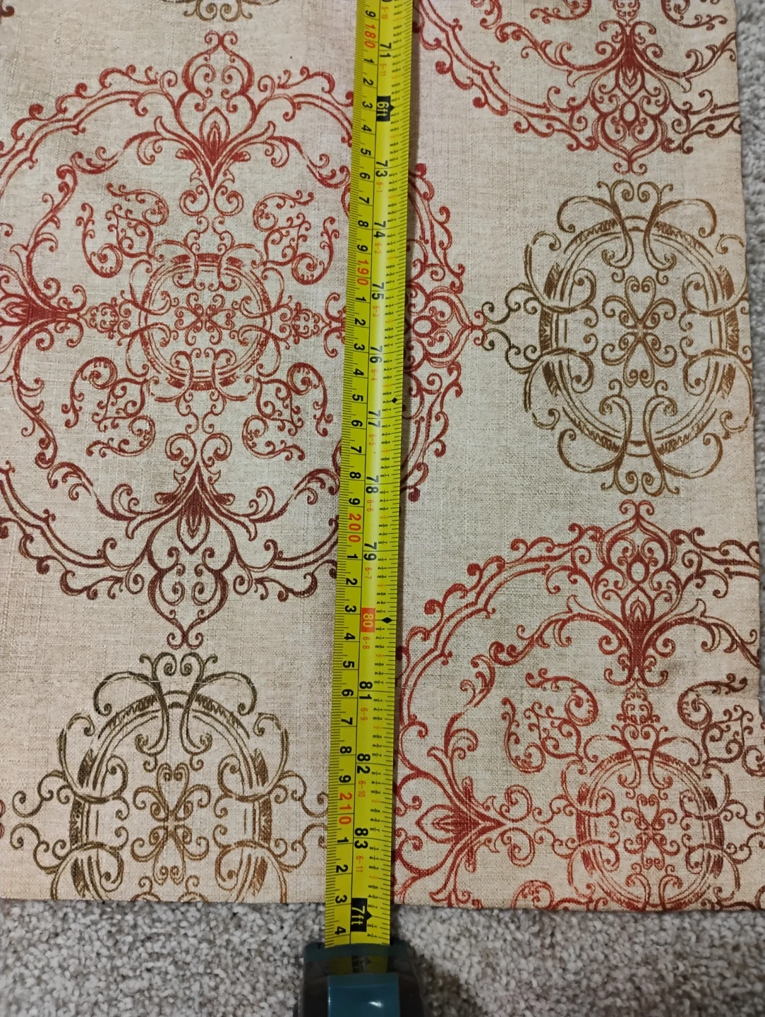 Here's a curtain with a lovely patterned design in beige, red, and brown. It measures approximately 84 inches in length and 54 inches in width. It would be a great addition to any room! Total 5 panels. The price is for each panel. Light filtering. Excellent condition.