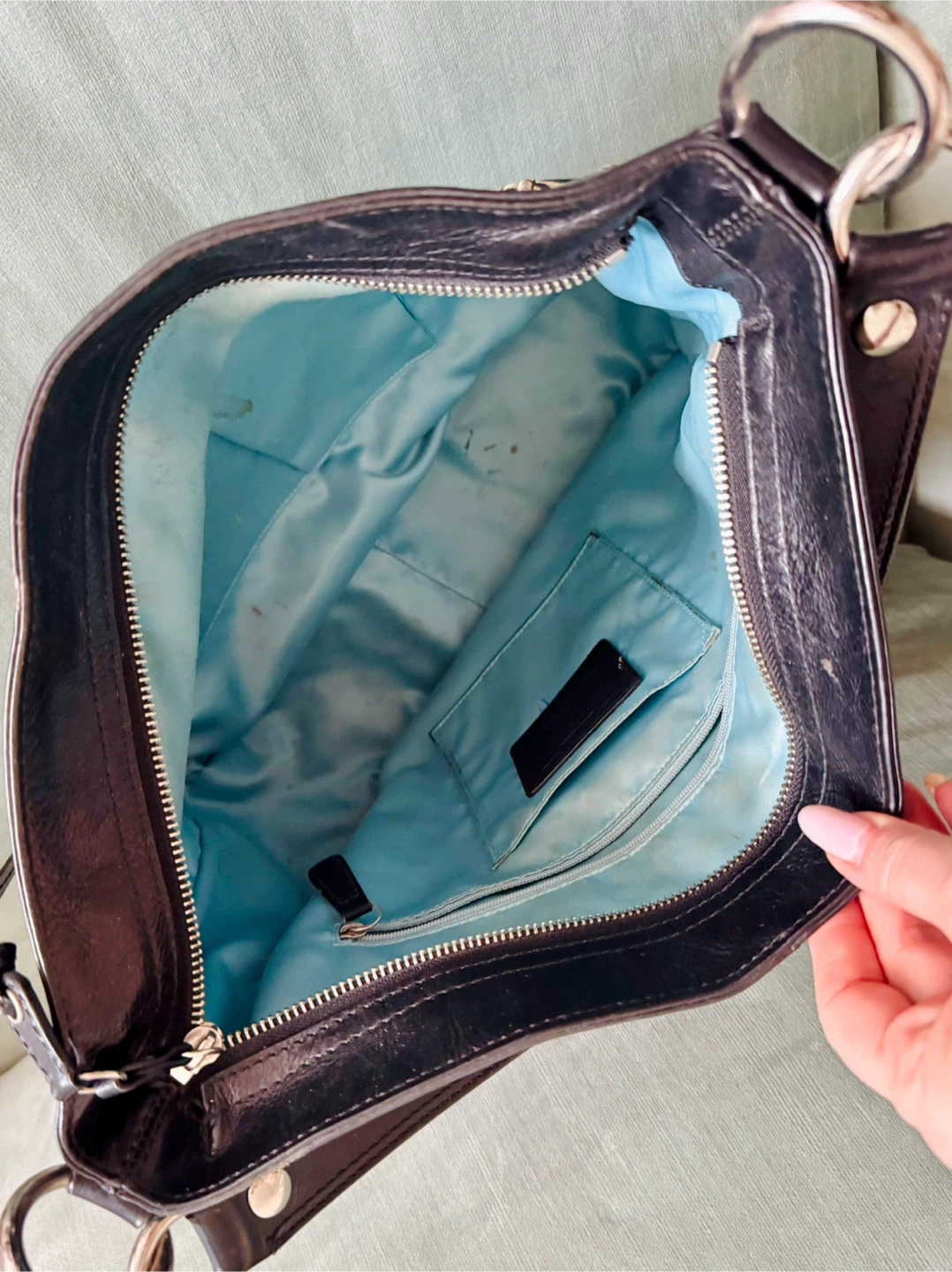 The bag features black leather trim and silver hardware. Perfect bag for everyday use!