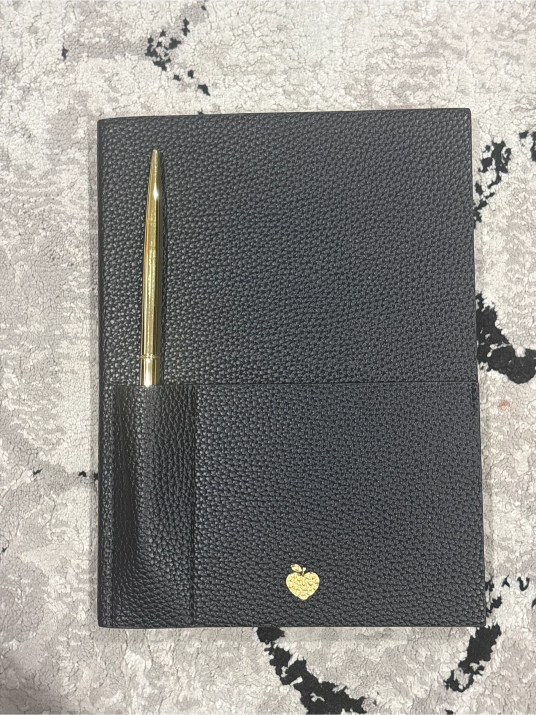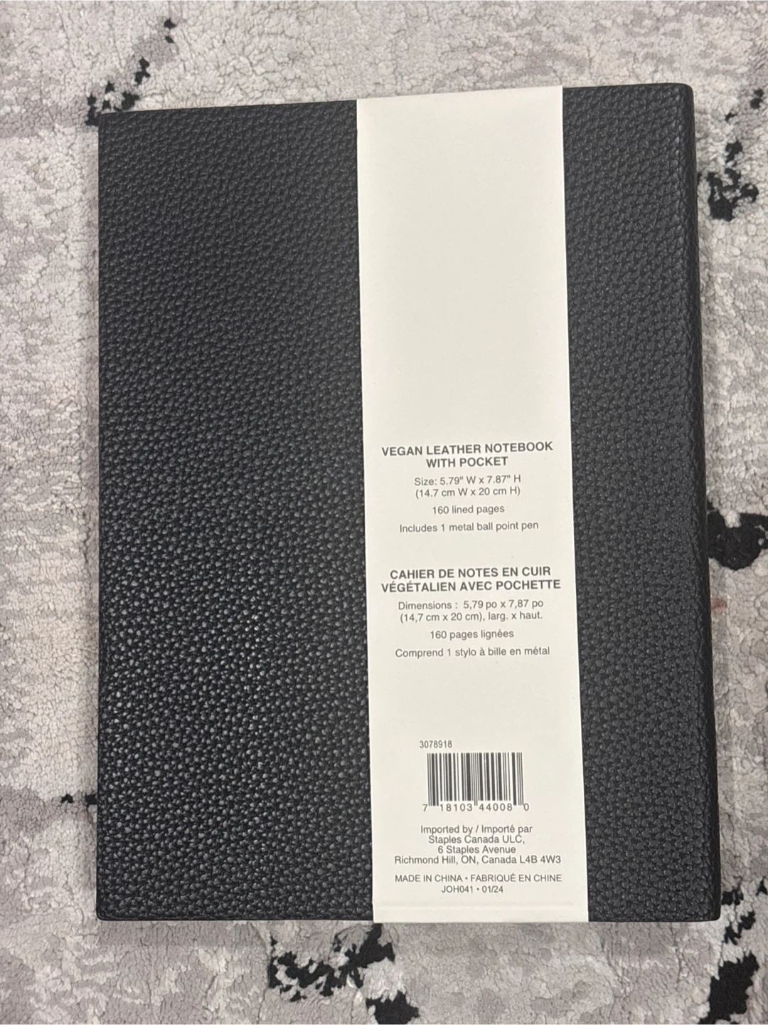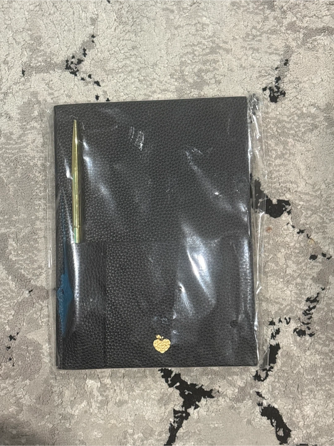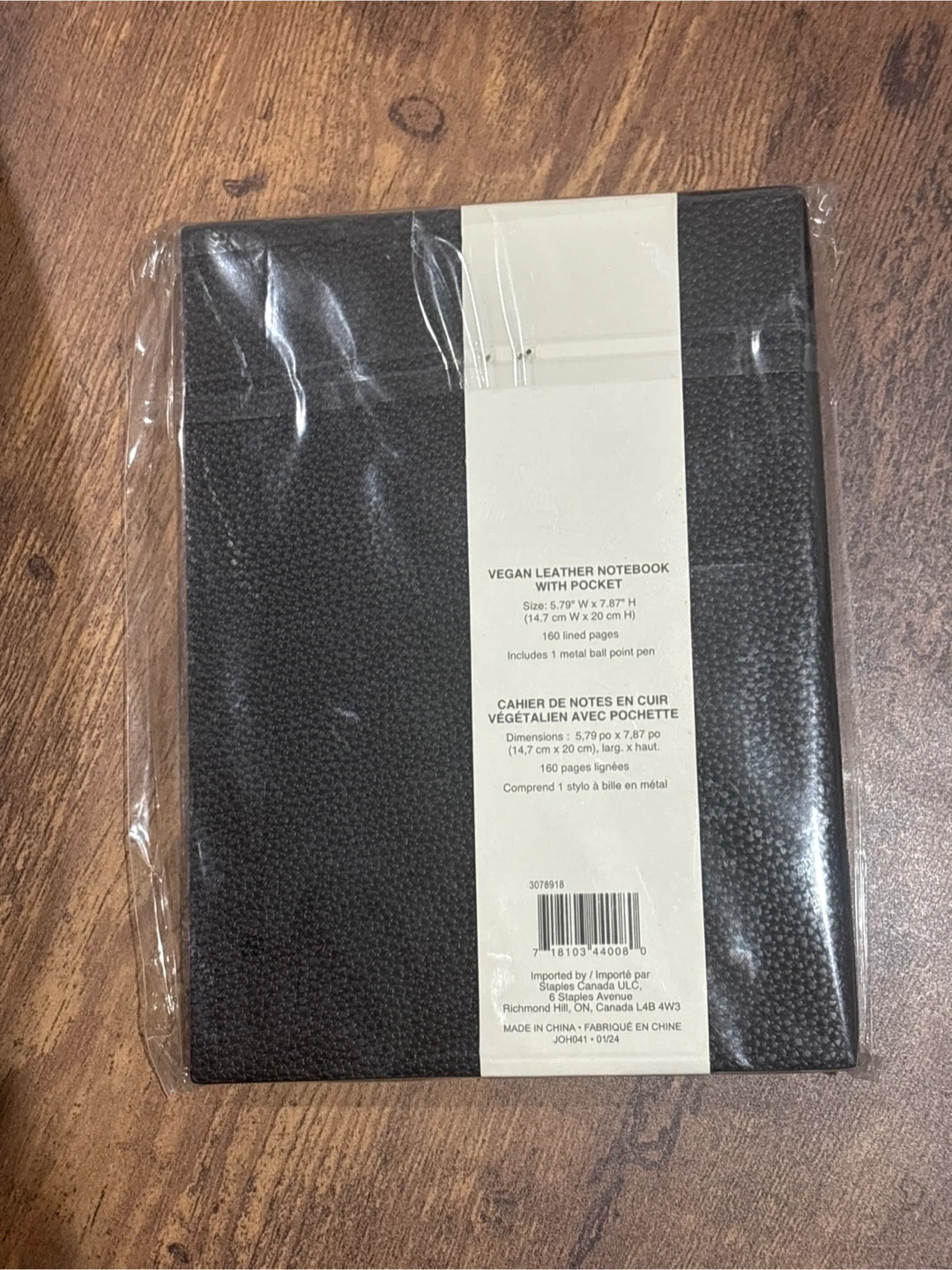 Here's a brand new vegan leather notebook! It comes with a pocket and includes a metal ballpoint pen. It's still sealed in the original packaging.