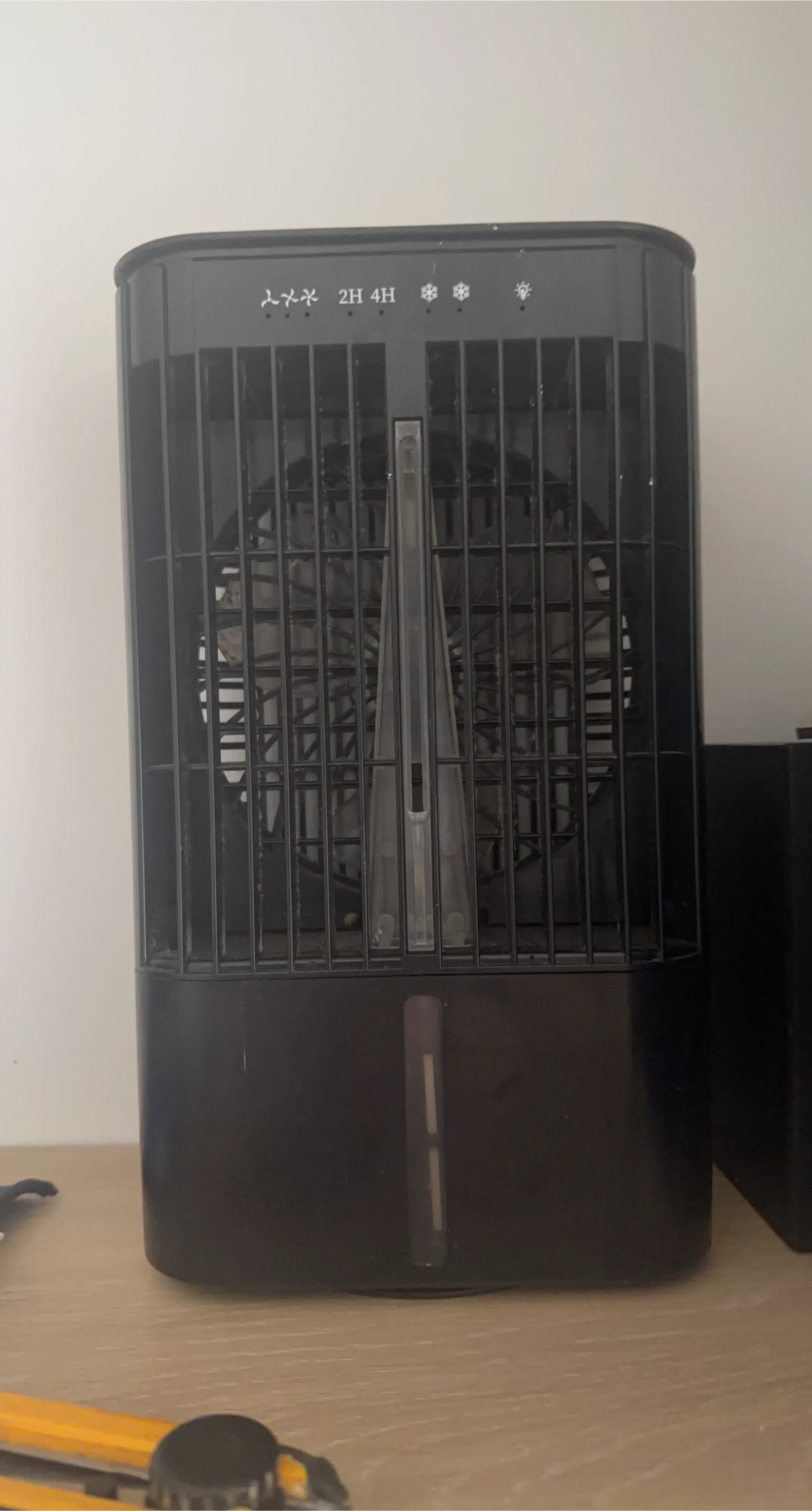 Selling a black portable air cooler. It has a water tank and multiple settings for fan speed and cooling intensity. Perfect for personal use in a small room or office