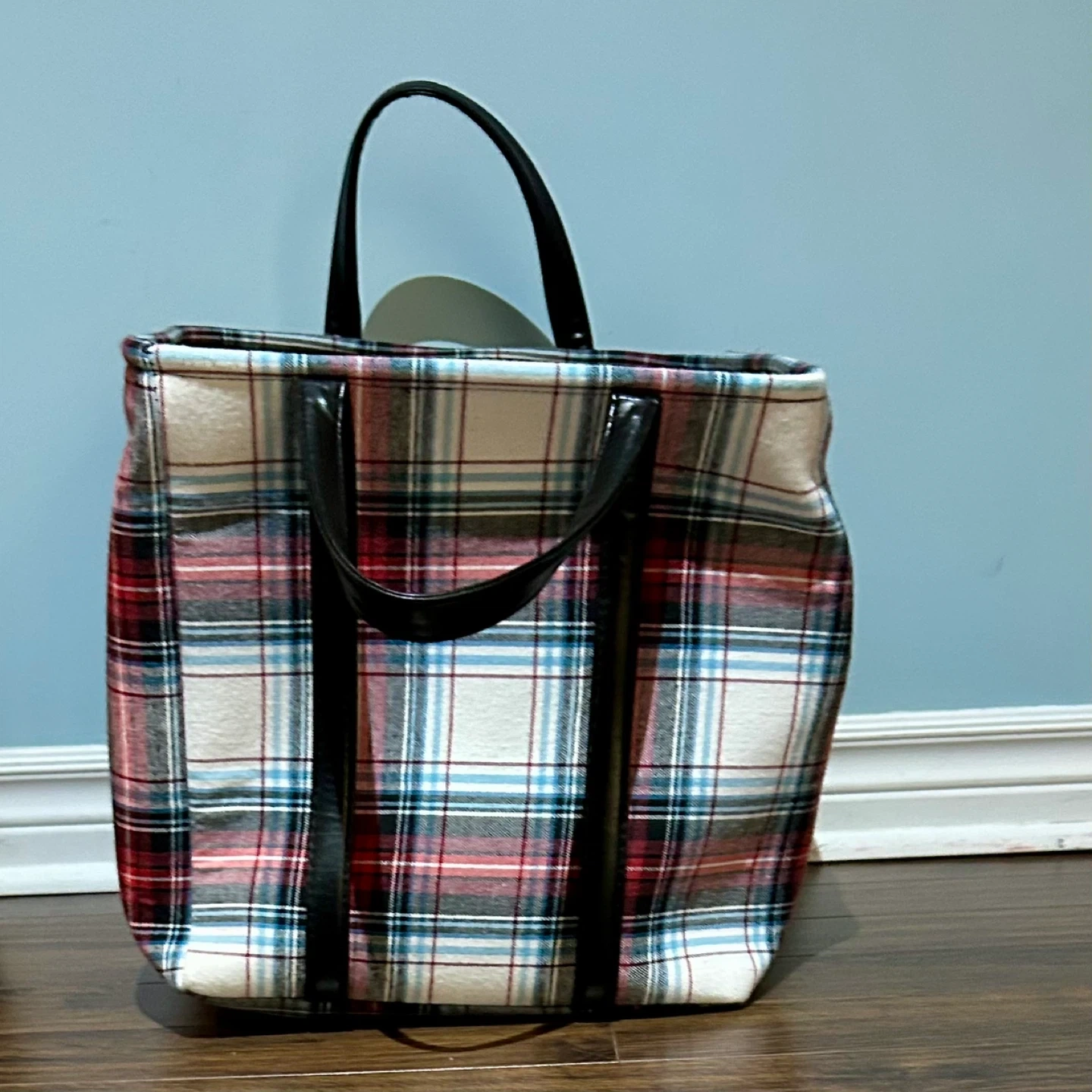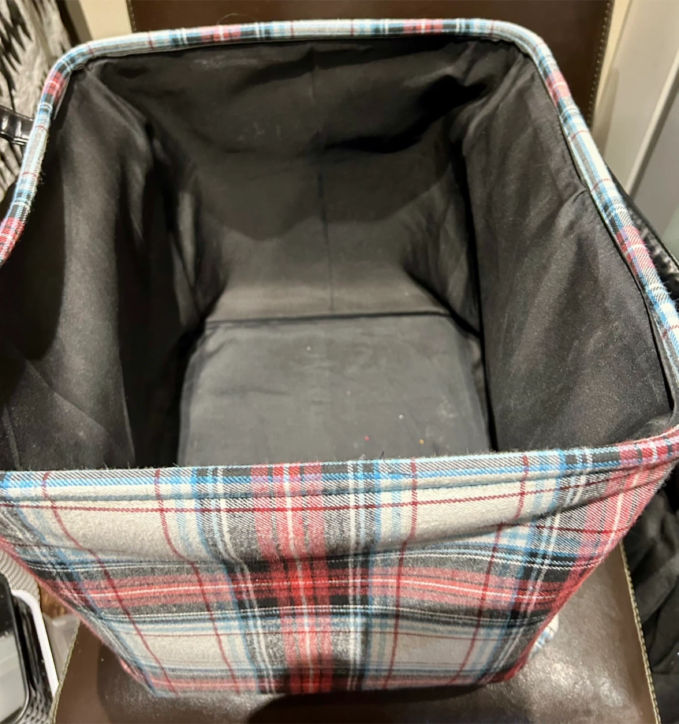 This is a square fabric bin. It has a beautiful plaid pattern and is perfect to store toys, blankets or anything else! It has black handles
