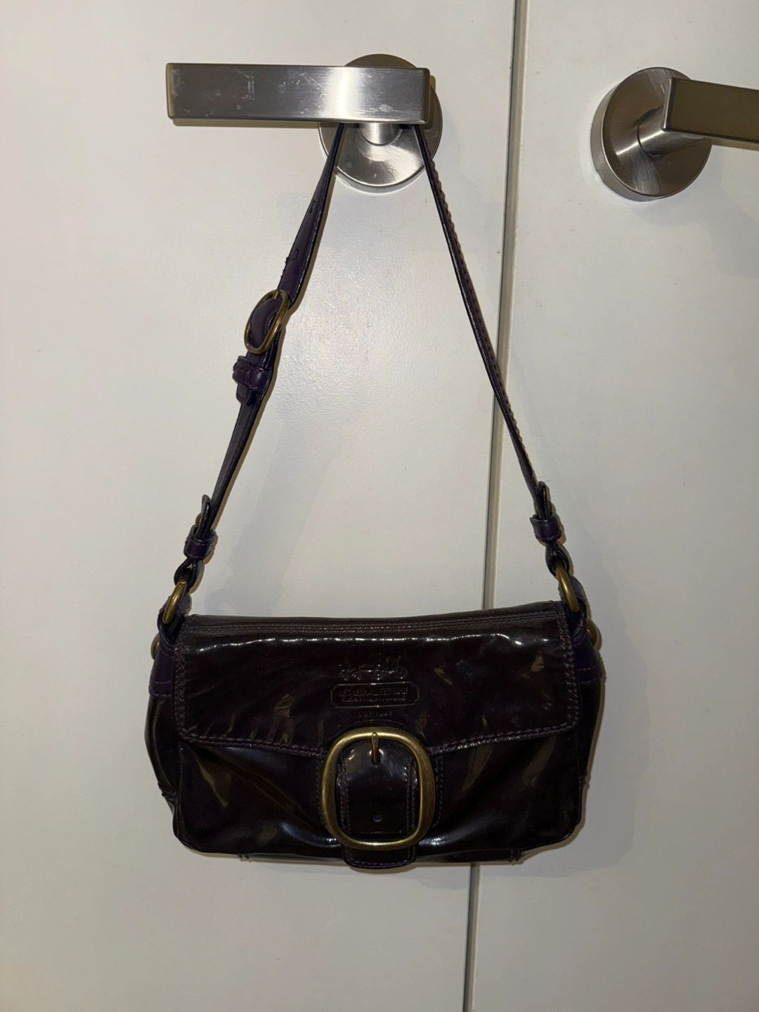 This is a cute Coach shoulder bag in a lovely shade of purple! It's made of leather and features a buckle detail. The interior has a plaid pattern. It's a stylish and practical accessory to add to your collection. Pick up by the Eaton Center.