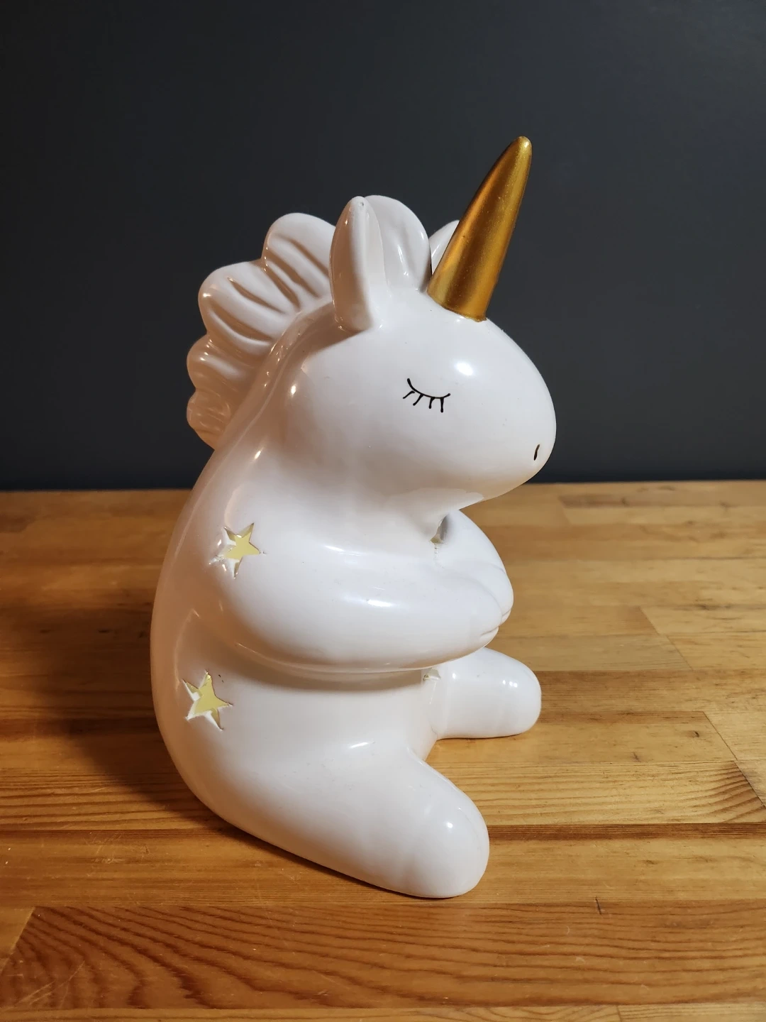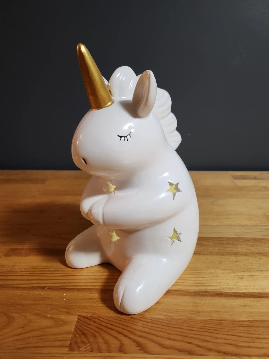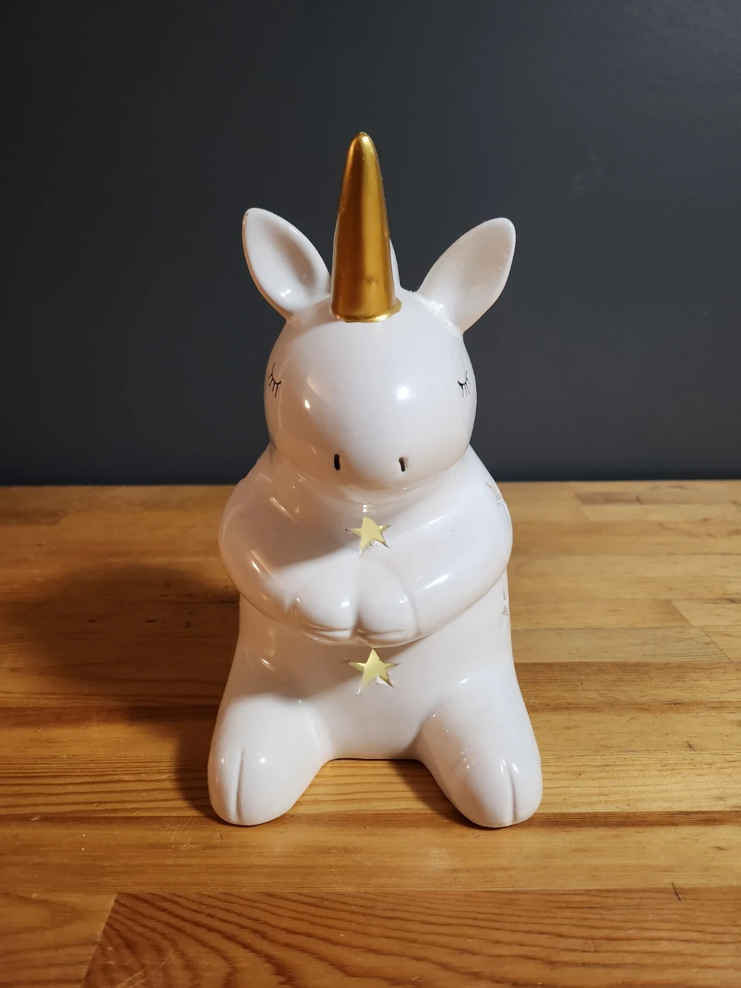 This adorable unicorn light is perfect for anyone who loves unicorns! It's white with a gold horn and little star cutouts that let the light shine through. It's in great condition and provides a soft, comforting glow. Requires 3 AAA batteries.