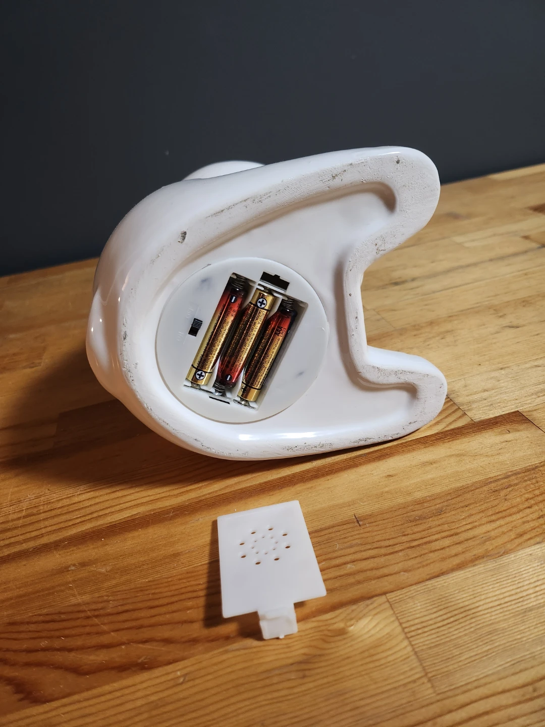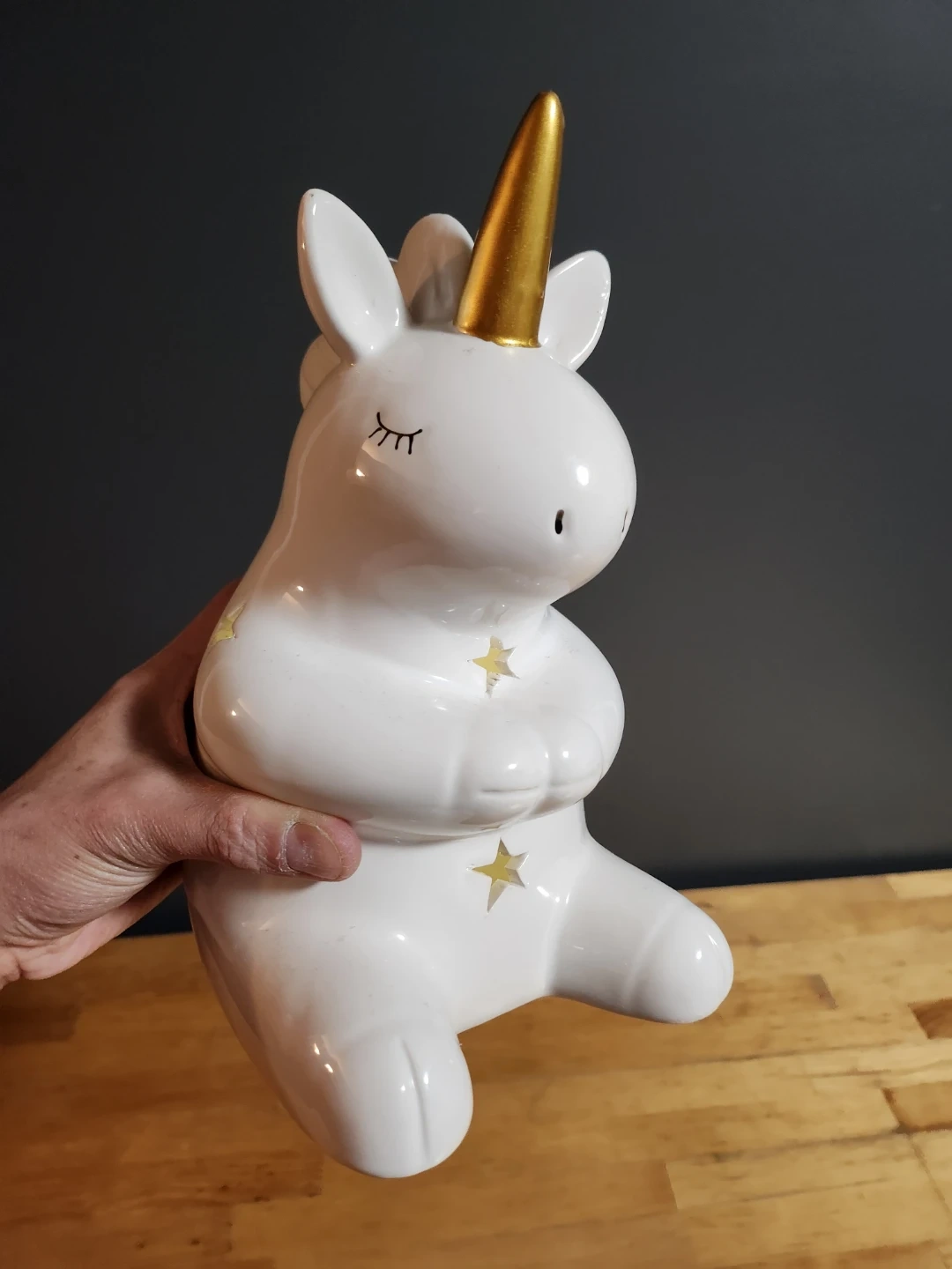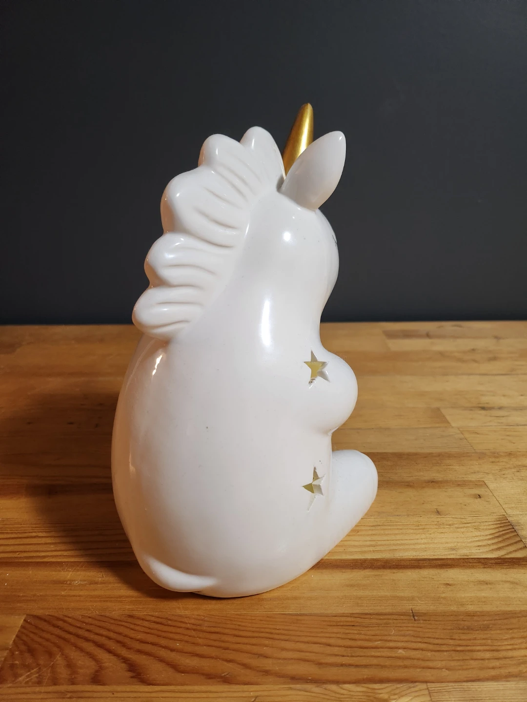 This adorable unicorn light is perfect for anyone who loves unicorns! It's white with a gold horn and little star cutouts that let the light shine through. It's in great condition and provides a soft, comforting glow. Requires 3 AAA batteries.