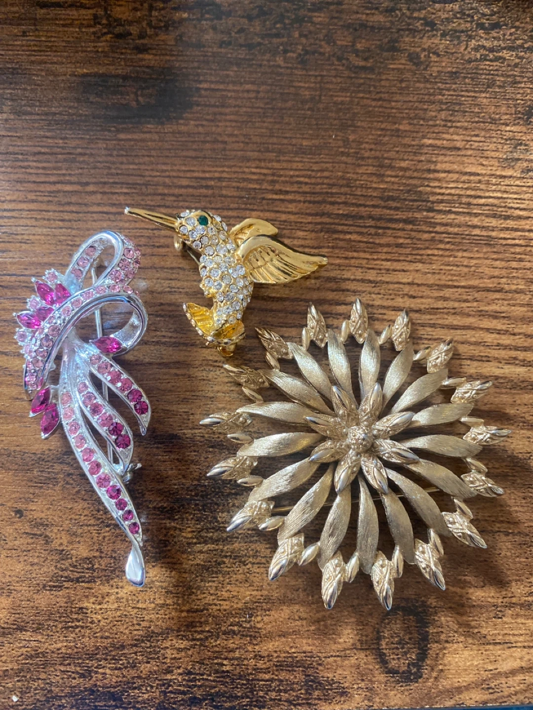 Selling a set of three vintage brooches. There is a silver brooch with pink rhinestones, a gold hummingbird brooch with rhinestones, and a gold flower brooch. They're in good condition and ready to accessorize your outfits!