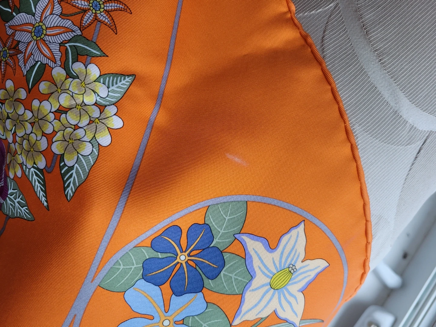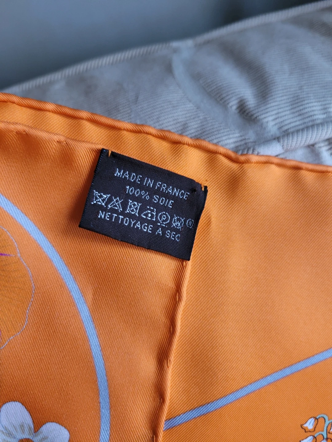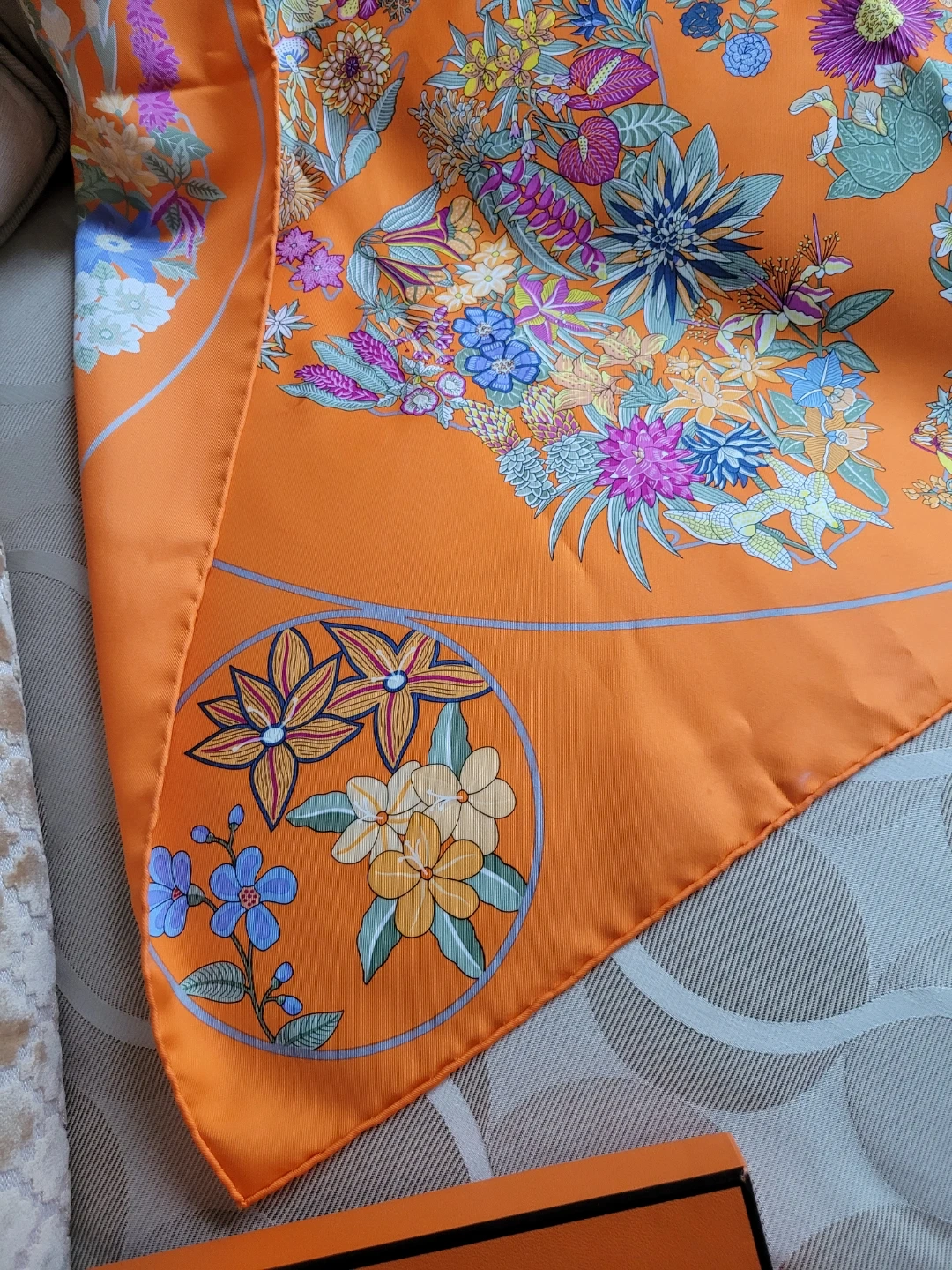 Selling a beautiful Authentic Hermès Paris silk scarf in an orange colour with a floral design. The scarf is 100% silk and comes with its original box. It features the 'Planifleurs' design. Perfect for adding a touch of elegance to any outfit! It has only been worn a couple of times, it does have a little mark on it see last picture, it will most likely come out from dry cleaning, however not noticeable. Just want full disclosure!