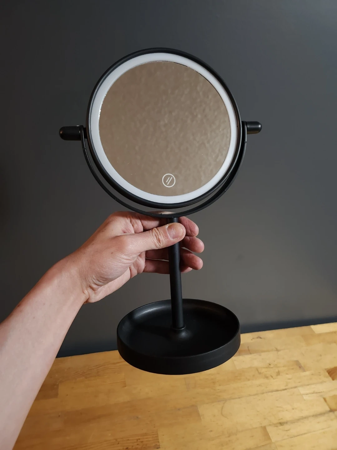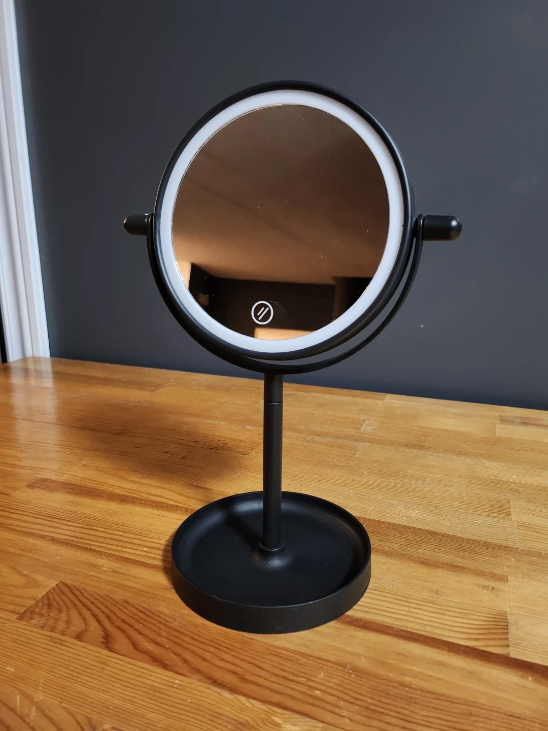Black vanity mirror with built-in touch LED lighting. Perfect for your makeup routine or just checking yourself out. It has a sleek, modern design that would look great on any vanity or dresser. Requires 4 AAA Batteries.