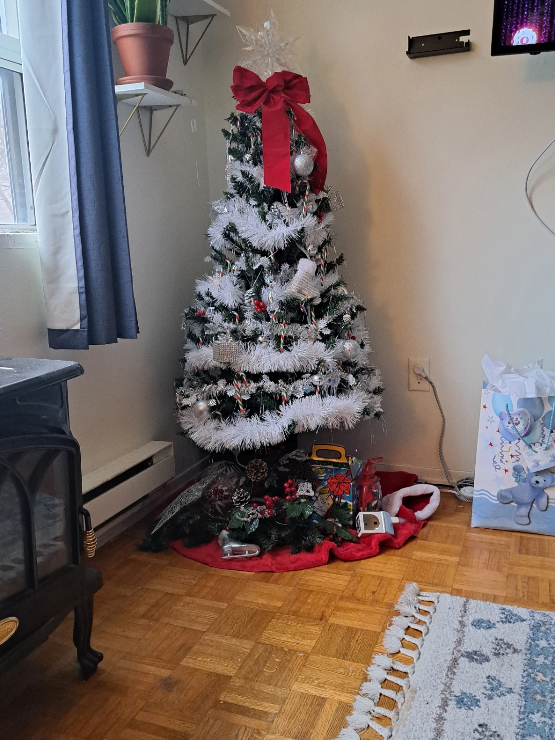 Selling a charming decorated Christmas tree. It comes with all the ornaments and decorations you see in the picture, including the red bow on top. Perfect for adding some festive cheer to your home this holiday season star and tree light up with soft white light
