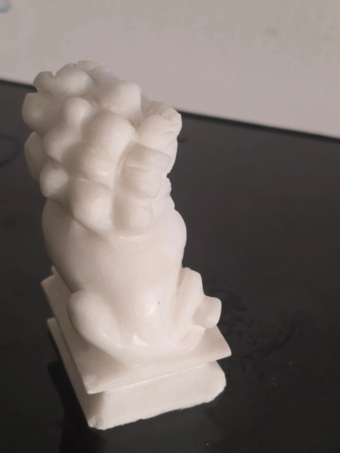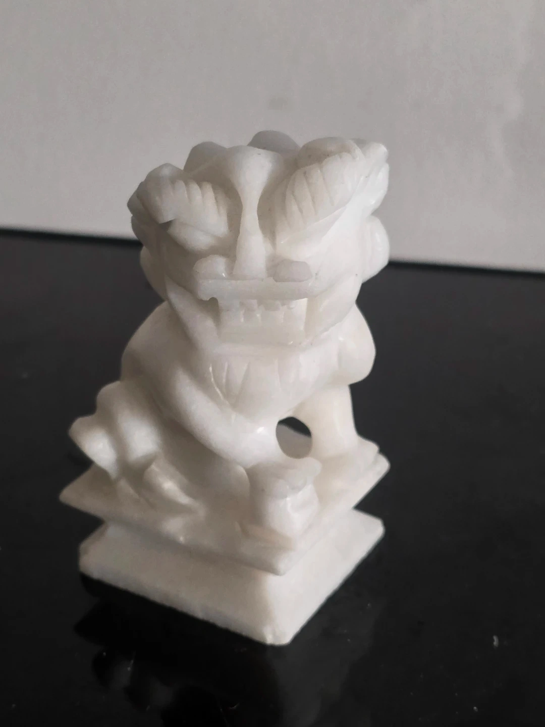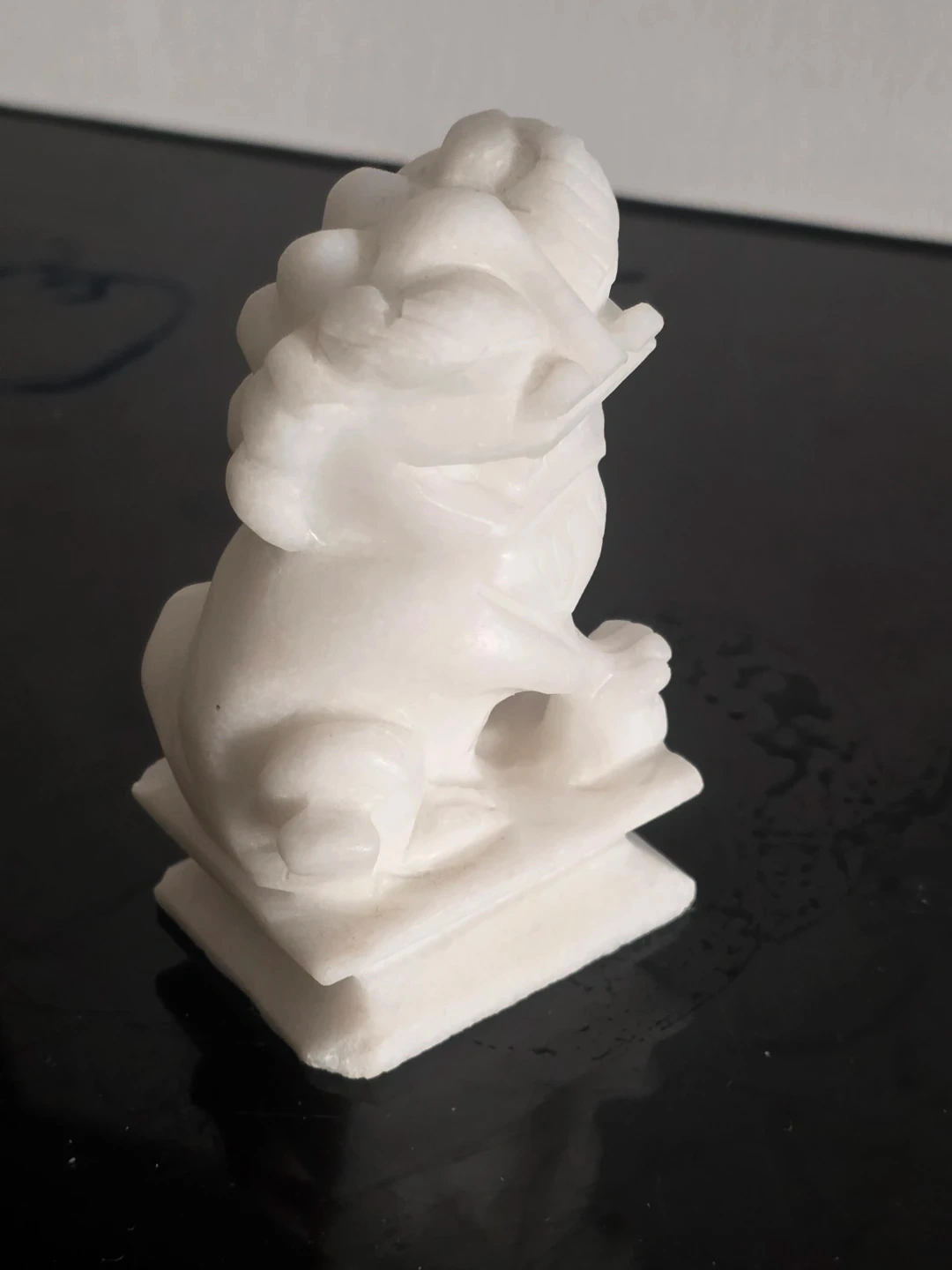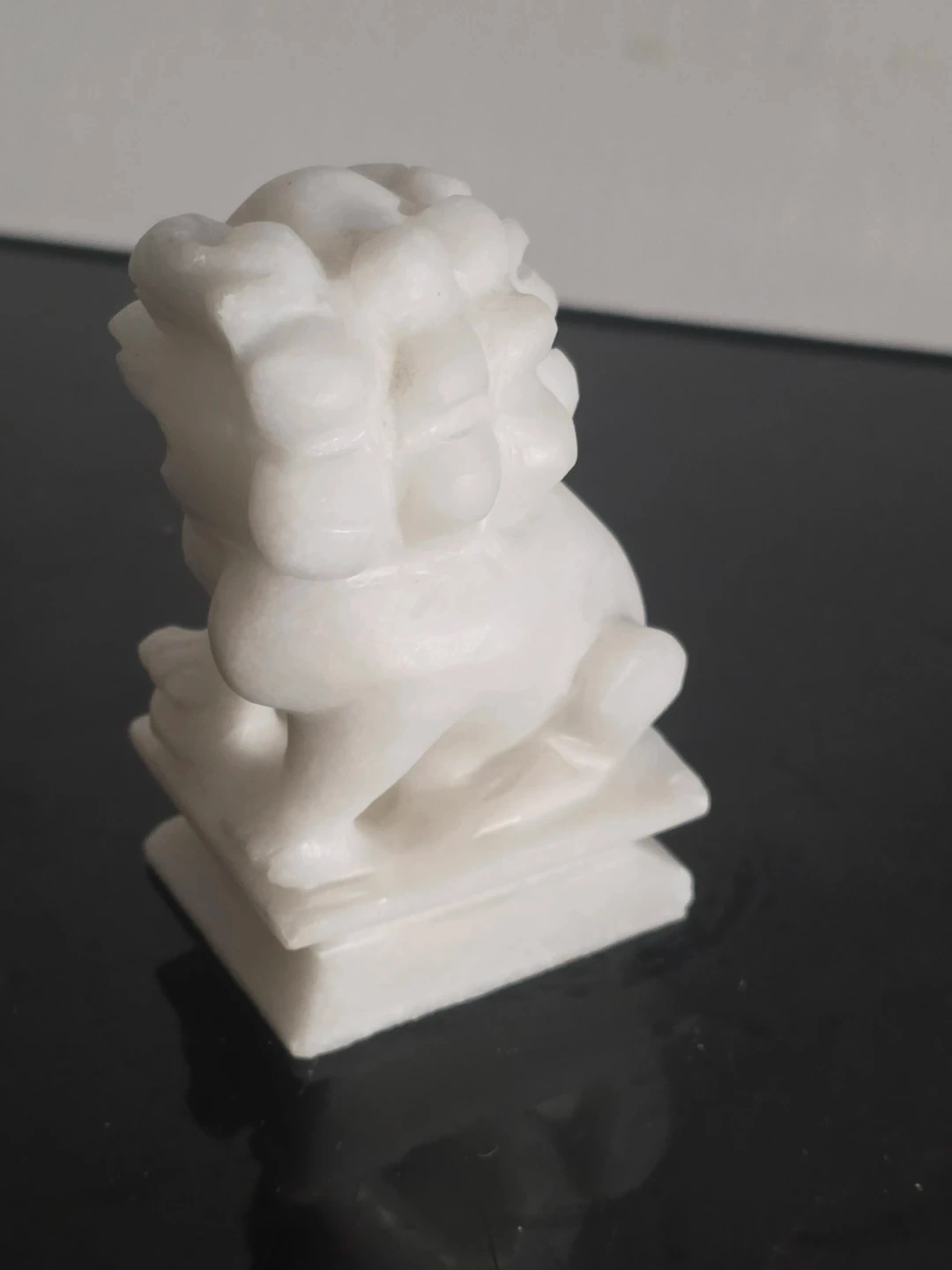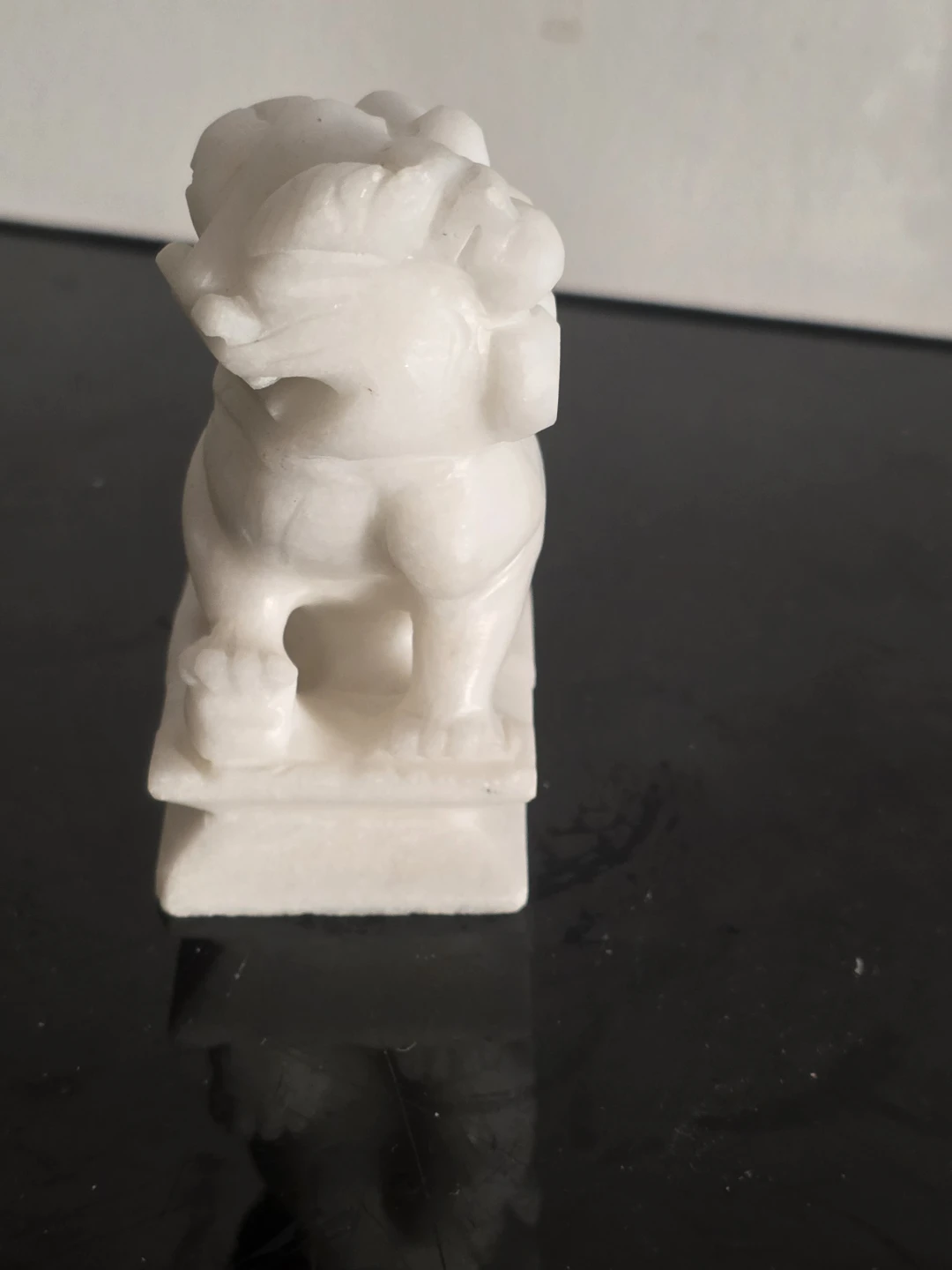 I have two. As hand carved similar but not identical. If you want pictures of second one let me know. This is a small, hand-carved white stone Chinese guardian lion figurine, commonly known as a Foo Dog or Shishi. Foo dogs are traditional Chinese guardians symbolizing power and wealth, believed to protect a family's status. The material appears to be white marble or alabaster. The figurine is seated on a square base and features detailed carving of the mane and face. Similar vintage pieces often date to the second half of the 20th century. 3 1/2 inches high