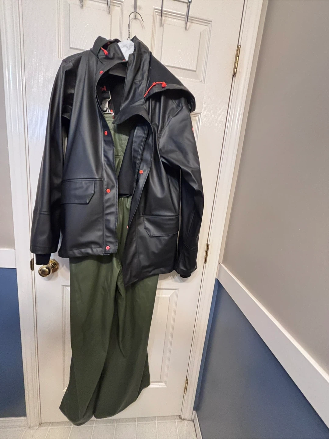 Selling a Helly Hansen Gale rain jacket and bib overalls set. The jacket is black with red accents, and the overalls are green. Perfect for staying dry on rainy days!