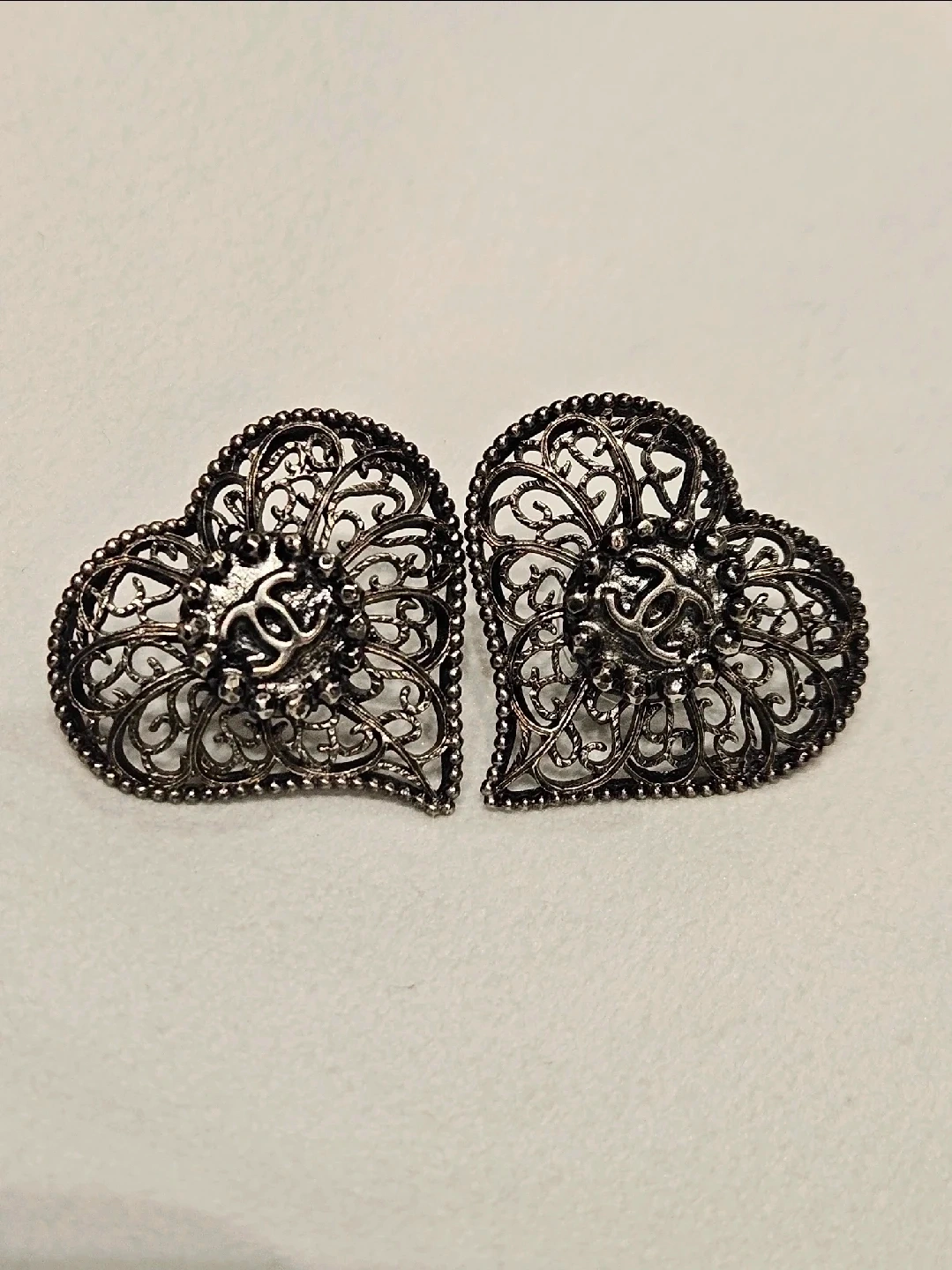 Selling a pair of Chanel heart earrings. These have a filigree design and the classic Chanel logo in the center. They are in good condition and ready to wear! Perfect for adding a touch of elegance to any outfit and a nice evening out.