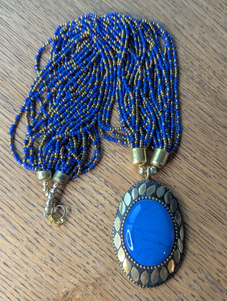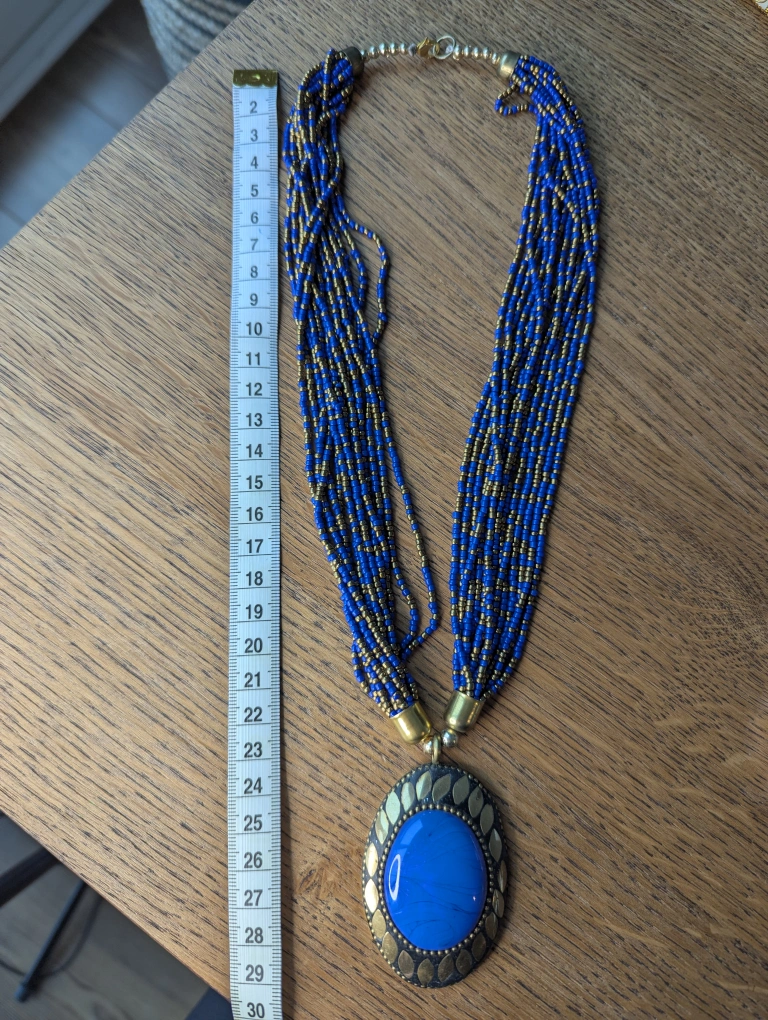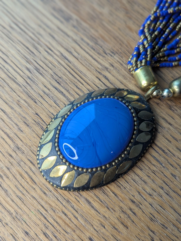 This is a beautiful blue and gold beaded necklace with a large blue pendant. The necklace measures approximately 32 cm in length. It's in great condition and ready to add a pop of colour to any outfit.