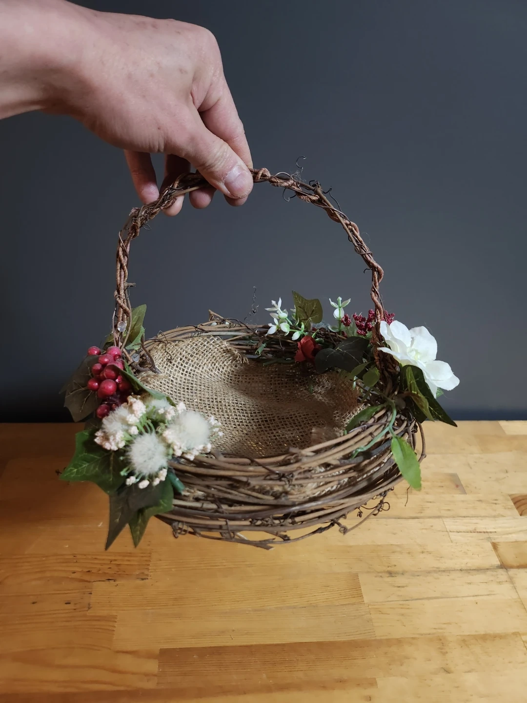 Cute floral decorated basket and matching headband! Perfect for adding a touch of spring to your home or a special occasion. The basket is made of woven twigs and features artificial flowers and burlap lining. The headband has similar floral accents.