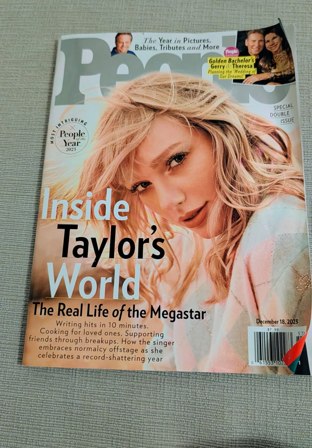 Selling a copy of People Magazine from December 18, 2023. It's the special double issue featuring 'Inside Taylor's World' and 'The Real Life of the Megastar'. It also includes 'The Year in Pictures, Babies, Tributes and More' and a feature on 'Golden Bachelor's Gerry & Theresa'. Originally priced at $7.99