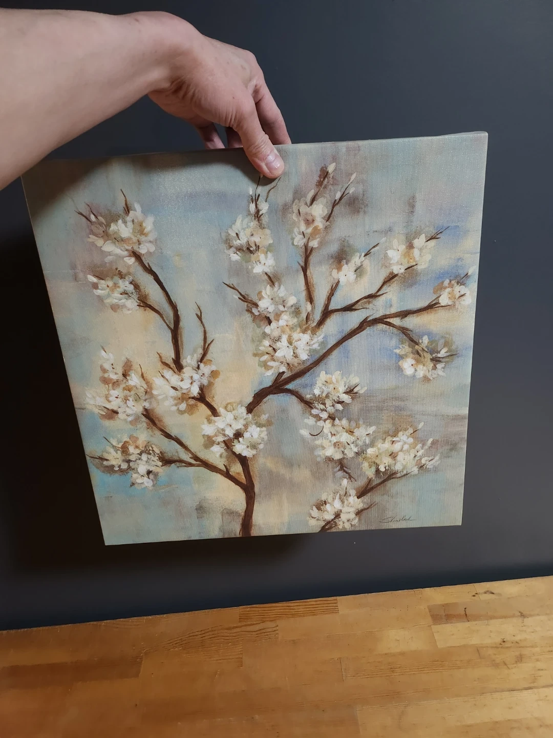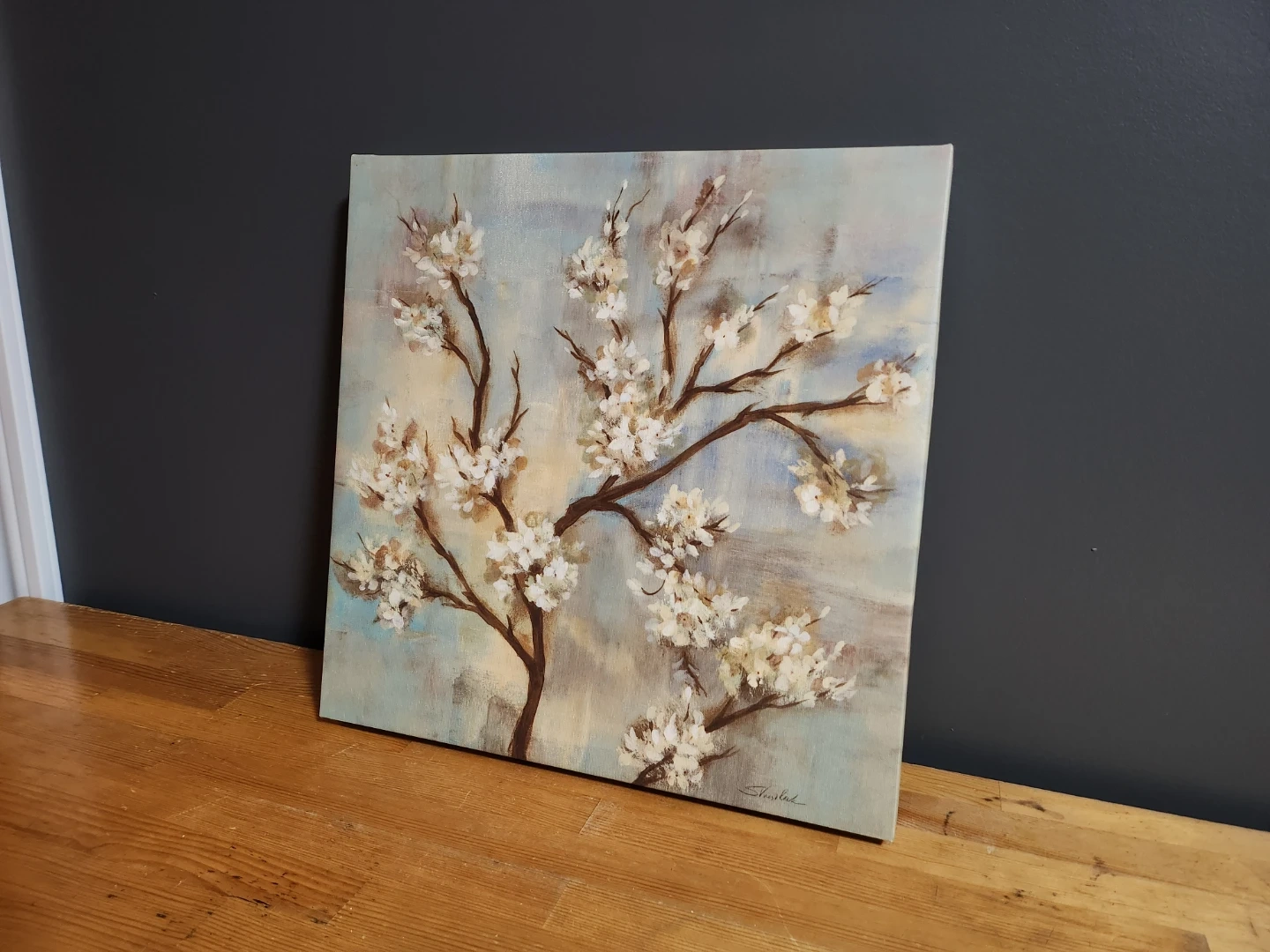 A lovely floral print canvas wall art piece. It features a beautiful tree with white blossoms against a soft blue and beige background. Perfect for adding a touch of nature to your home decor.