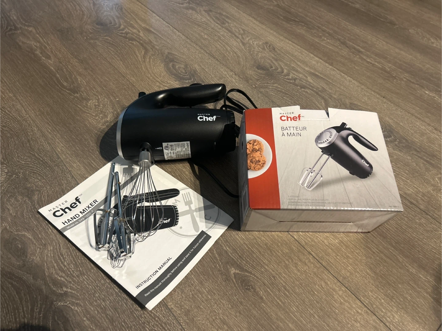 Selling a Master Chef hand mixer in great condition! It comes with the original box and all attachments, including two beaters and a whisk attachment. The mixer has 5 speed options and a heel rest for added stability. It's an ergonomic hand mixer providing 200 watts of peak power. Perfect for all your baking needs!