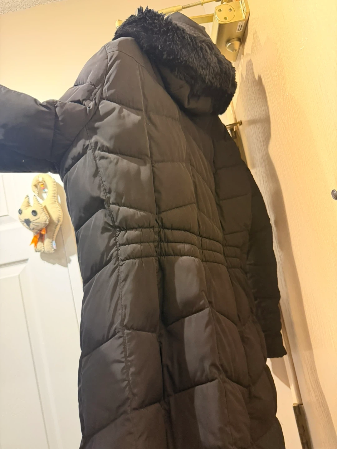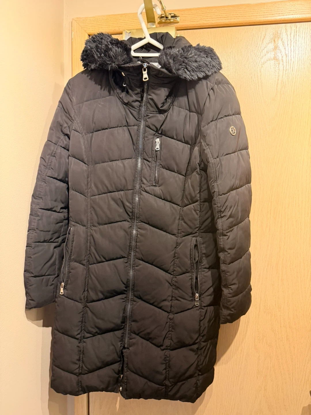 Selling a Calvin Klein black puffer coat. It's in good condition and ready for the colder weather. It has a faux fur hood and a flattering silhouette. It's a stylish and warm coat for the winter season!