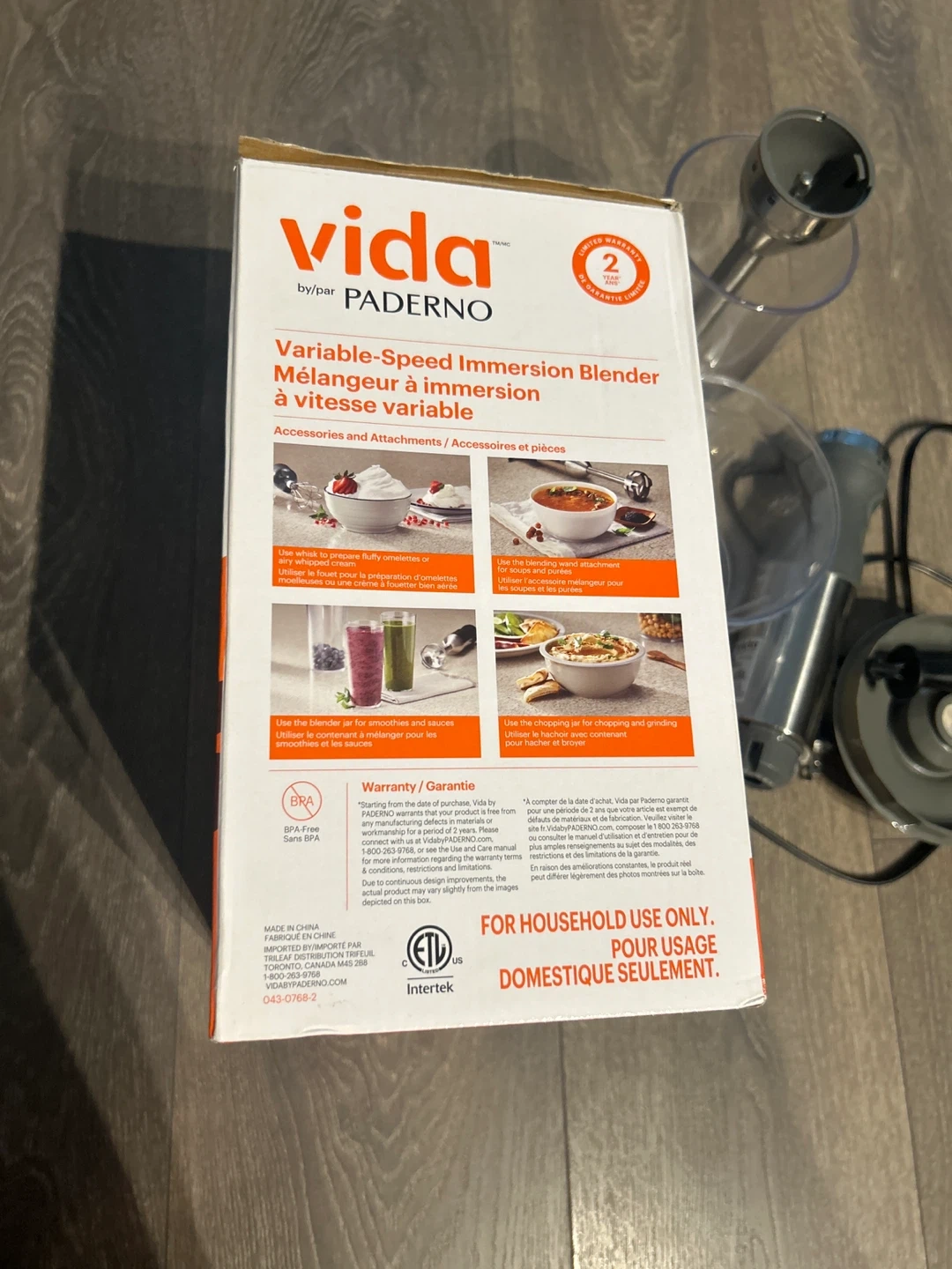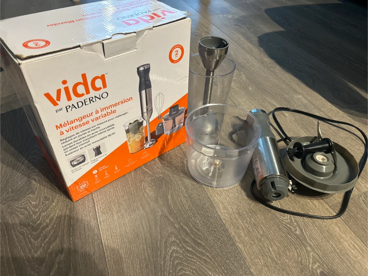 Selling a Paderno Vida variable-speed immersion blender. It comes with the accessories and attachments you need for blending, and chopping. The blender features a stainless steel blade and a comfortable grip. Includes the box!