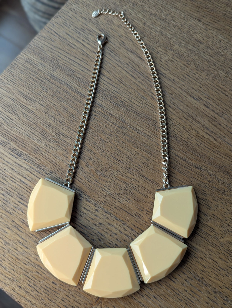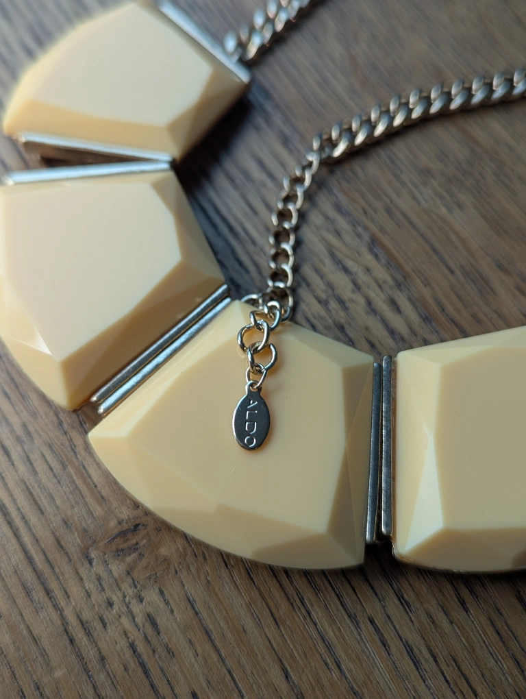 This Aldo statement necklace is in great condition! It features a cream-coloured geometric design with a silver-tone chain. Perfect for adding a unique touch to any outfit