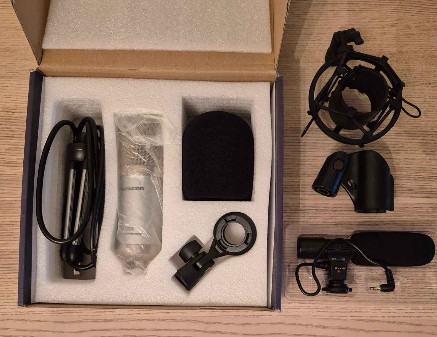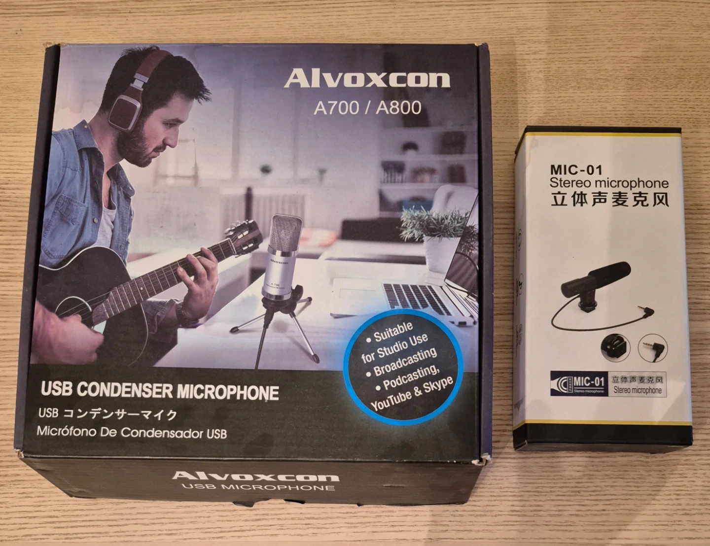 Selling Alvoxcon A700/A800 USB Condenser Microphone! This microphone is suitable for studio use, broadcasting, podcasting, and YouTube & Skype. It also comes with a MIC-01 stereo microphone. Also included is extra mic clips and a desk clamp boom arm.