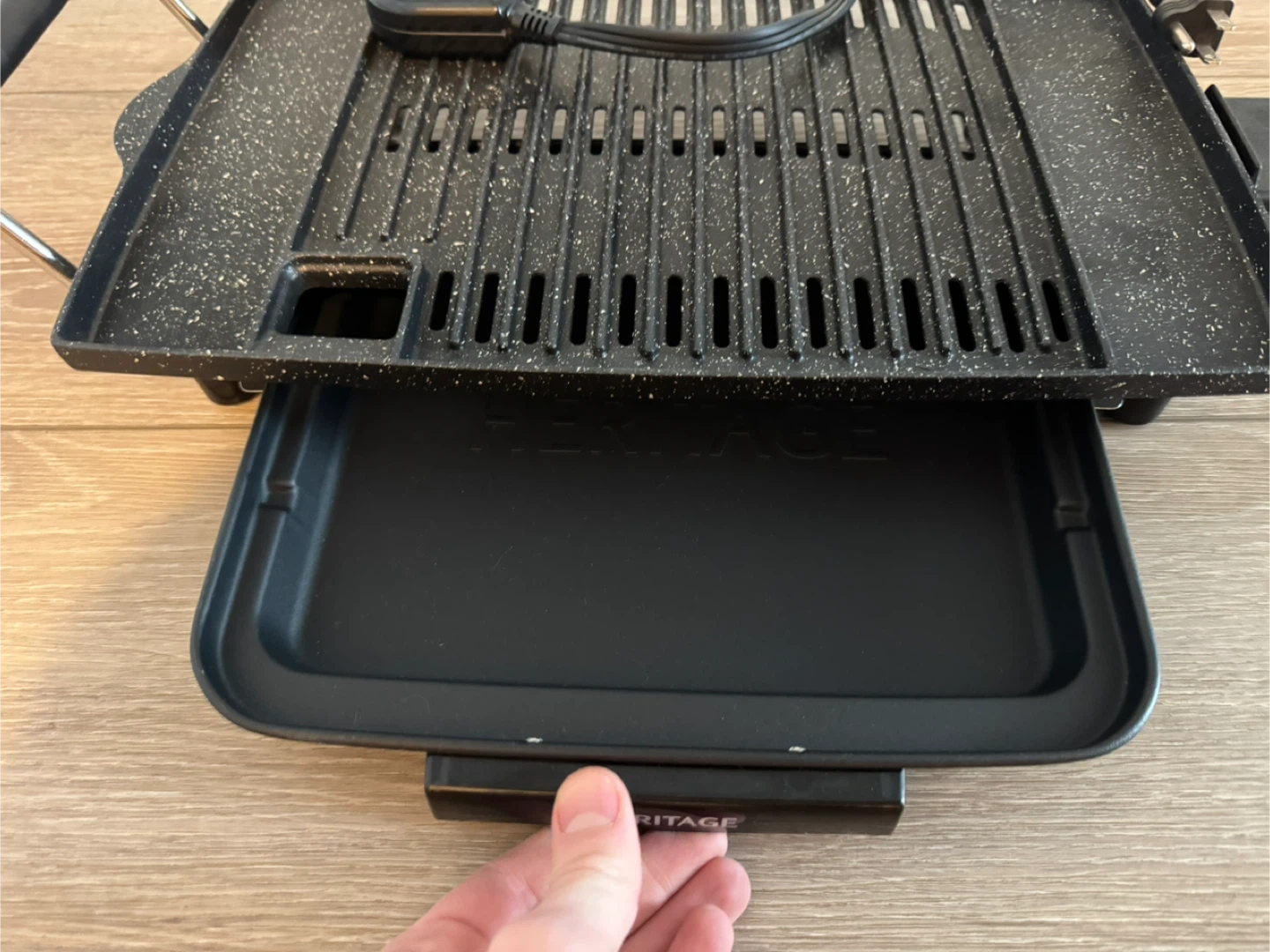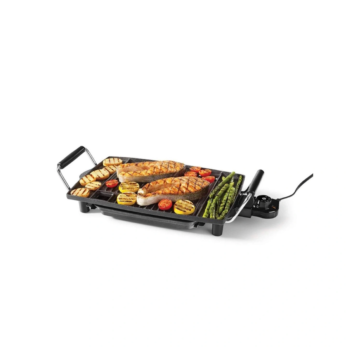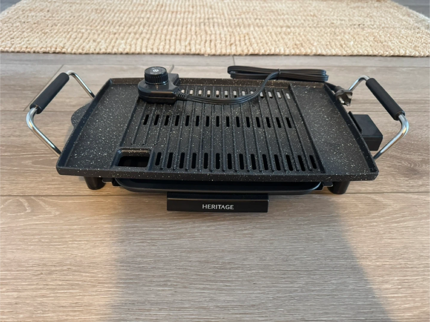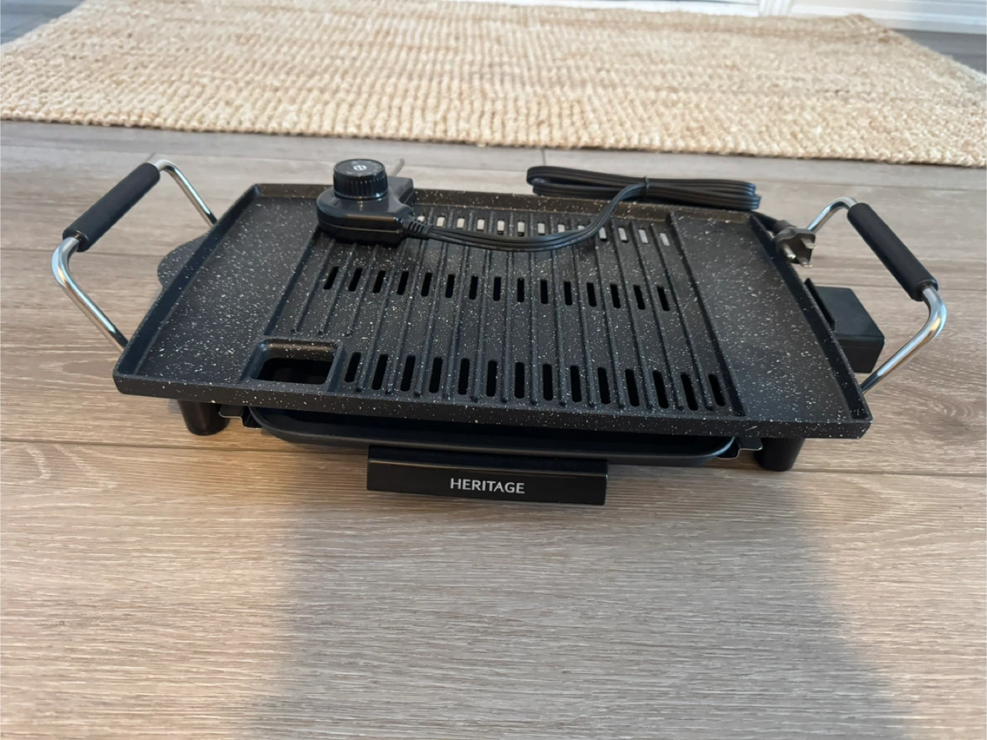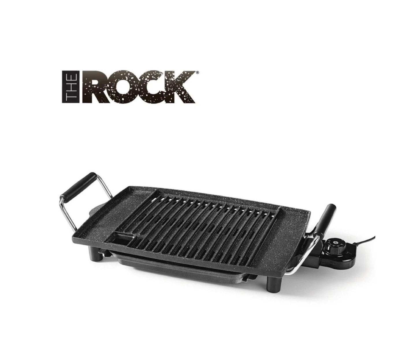 Heritage The Rock Indoor Non-Stick Electric Smokeless BBQ Grill is the perfect way to prepare delicious BBQ indoors without charcoal or gas. Its patented non-stick Rock technology allows for effortless food release, while the drip tray captures excess oil and grease to reduce smoke. With a spacious cooking surface, this indoor BBQ grill features a durable cast aluminum plate that evenly distributes heat. Adjust the temperature with ease and when finished cooking, simply remove the dishwasher-safe drip tray and plate for quick cleanup.