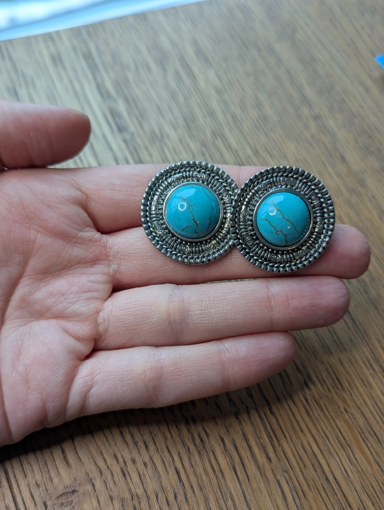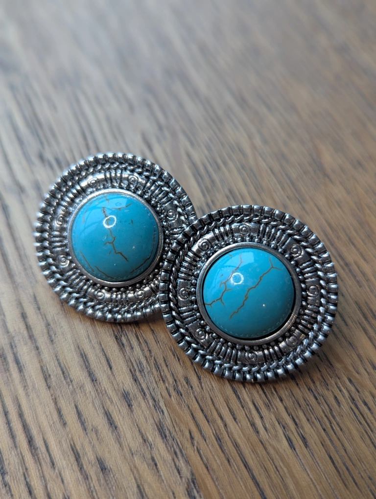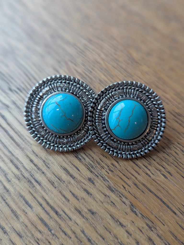 These earrings feature a faux turquoise stone set in a detailed silver-tone metal setting. They have a post back closure. Great for adding a pop of colour to any outfit!