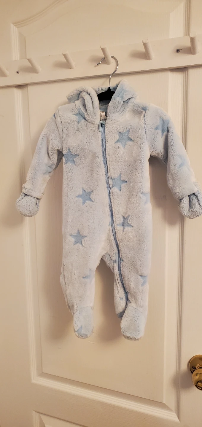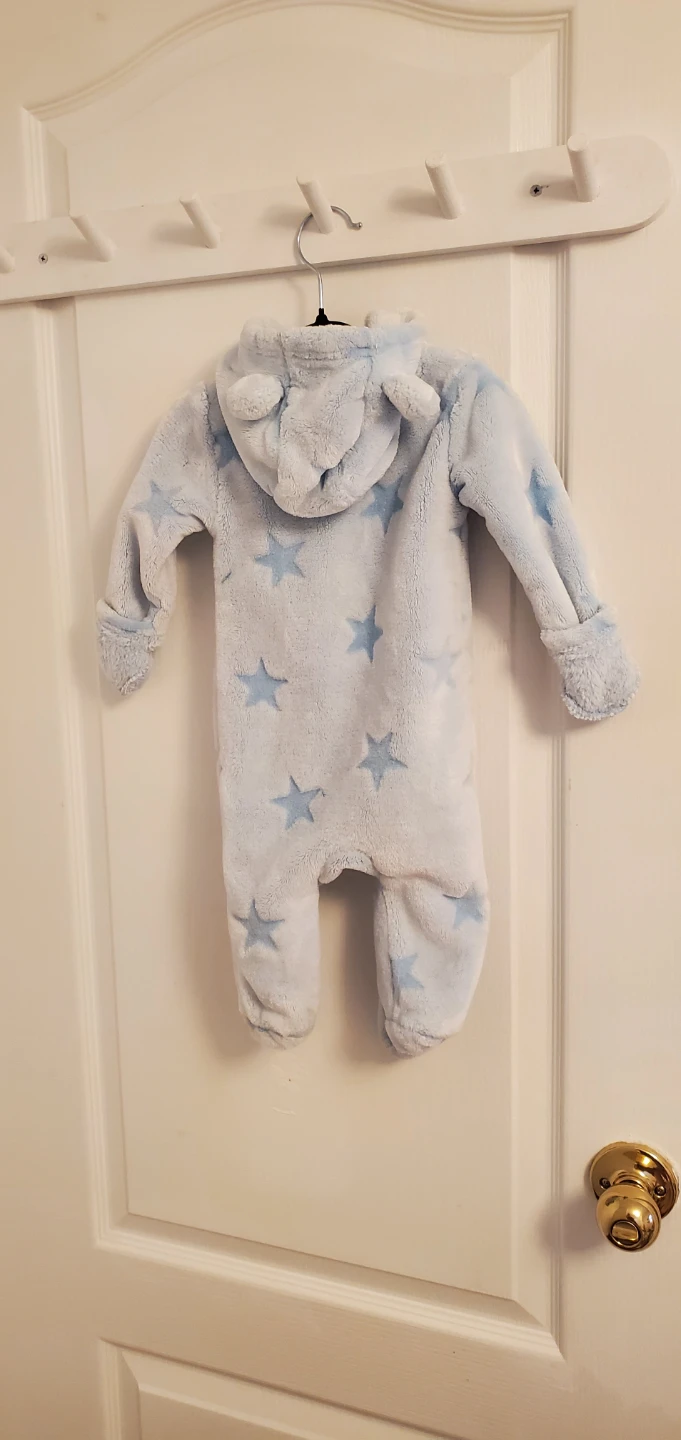A cozy baby blue fleece onesie with a star pattern, perfect for keeping your little one warm and snug! It features a hood with adorable bear ears and built-in mittens and booties to keep tiny hands and feet covered. Great for ages 3-6 months
