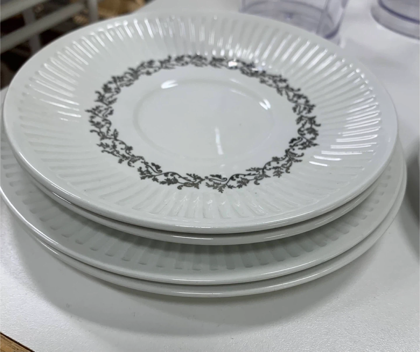 Selling a set of four white plates with a decorative floral pattern around the centre. They're in good condition and would look lovely on display or used for serving
