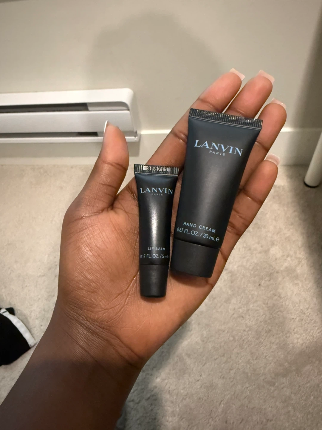 Selling a Lanvin Paris set that includes a lip balm (0.17 fl. oz./5 mL) and a hand cream (0.67 fl. oz./20 mL). Perfect for keeping your lips and hands moisturized!