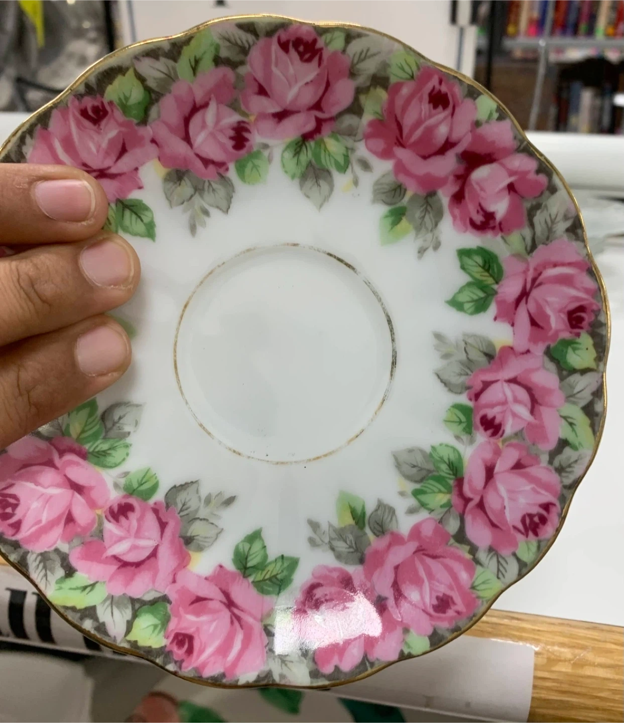 Selling a lovely Royal Albert saucer! It features a beautiful pattern of pink roses around the rim and a gold trim. Perfect for completing your tea set or adding a touch of elegance to your collection