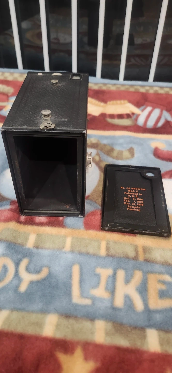 Selling a vintage Kodak No. 2A Brownie camera, Mod. C. It was patented in the U.S.A. on Oct 6, 1914, Feb 1, 1916, and Mar 21, 1916. Patents are pending. Great for collectors or as a unique decor piece!
