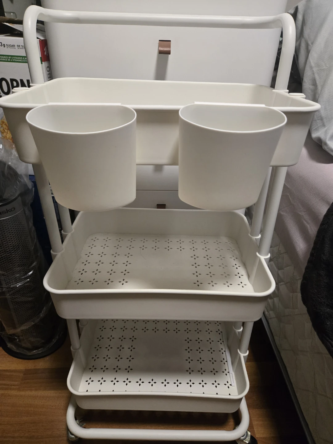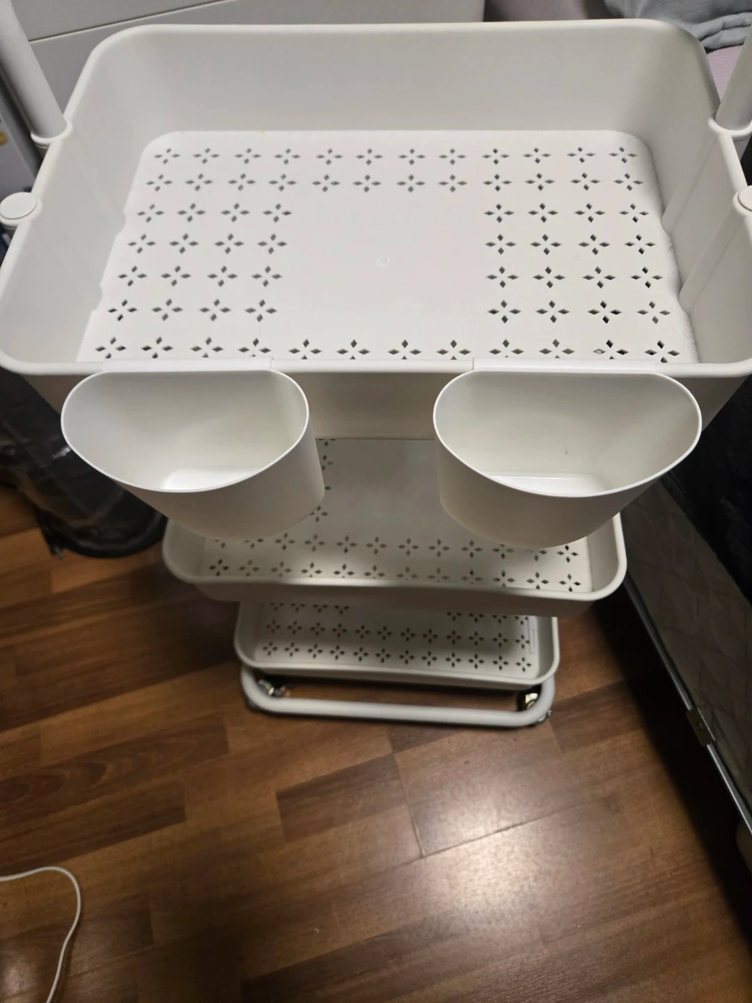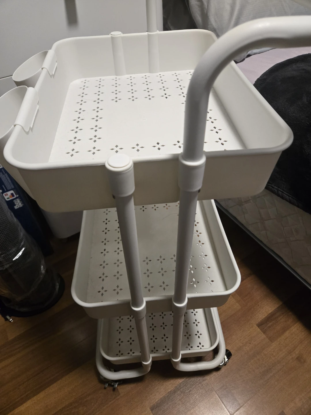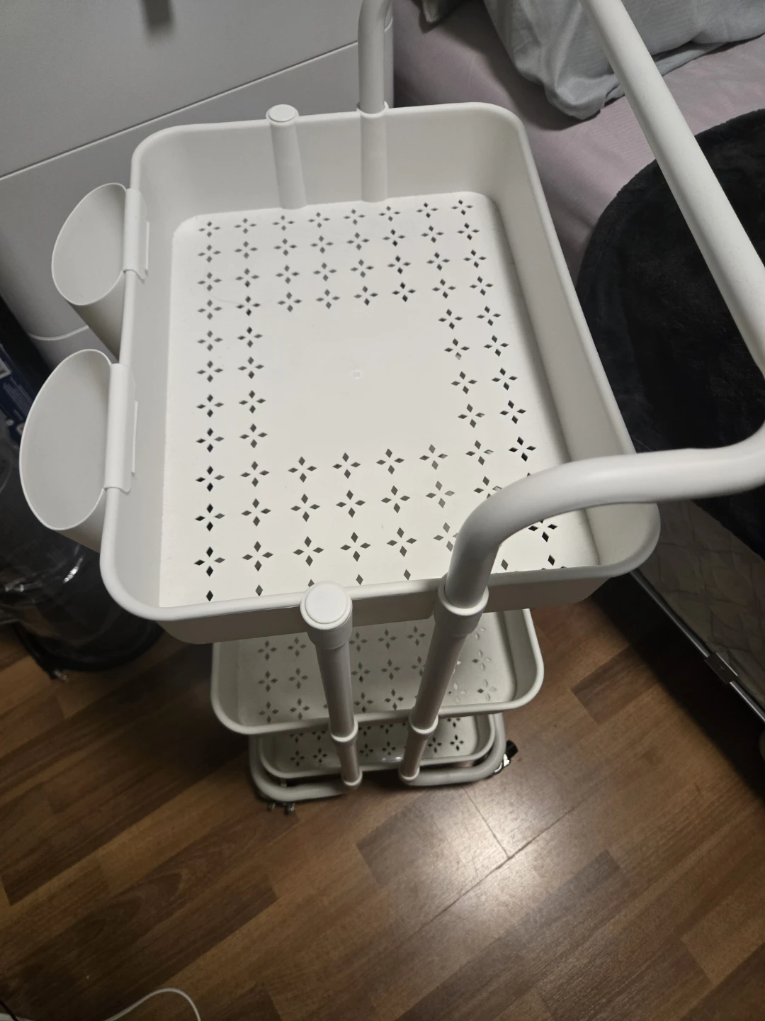 3-tier white trolley with wheels and 3 small hanging buckets