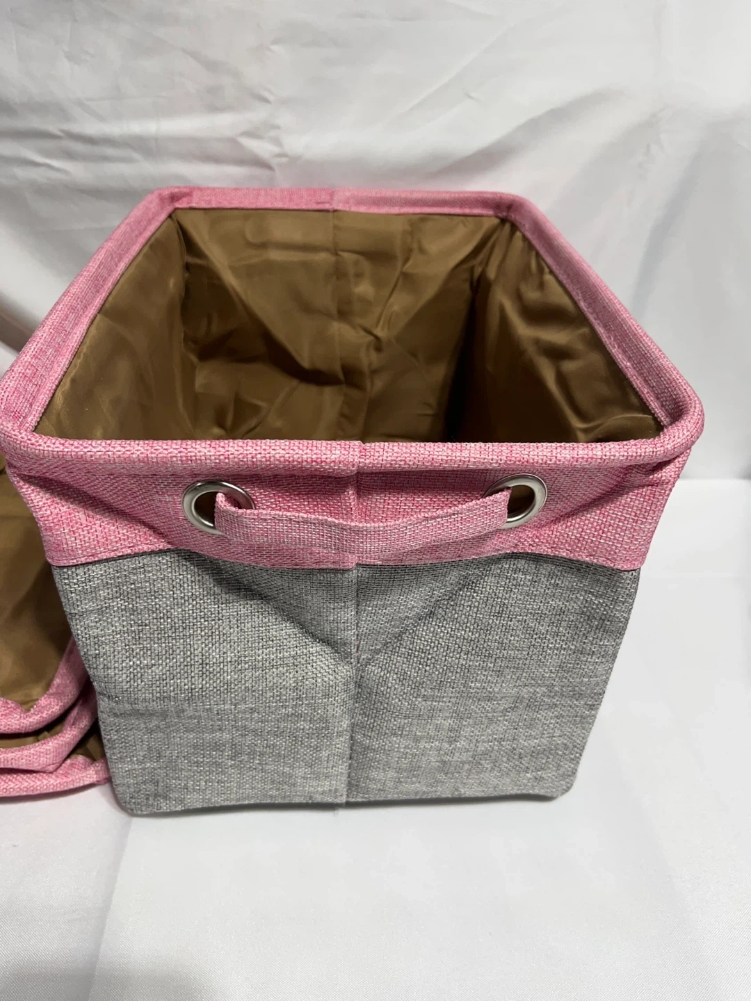 Here's a handy fabric storage bin in pink and grey! It's in great shape and ready to help you organize. The bin also comes with a lid for easy storage and stacking 15”x11”x9” inches