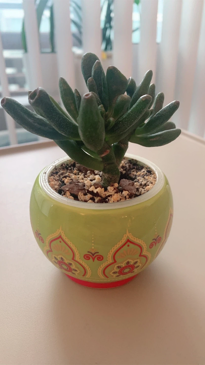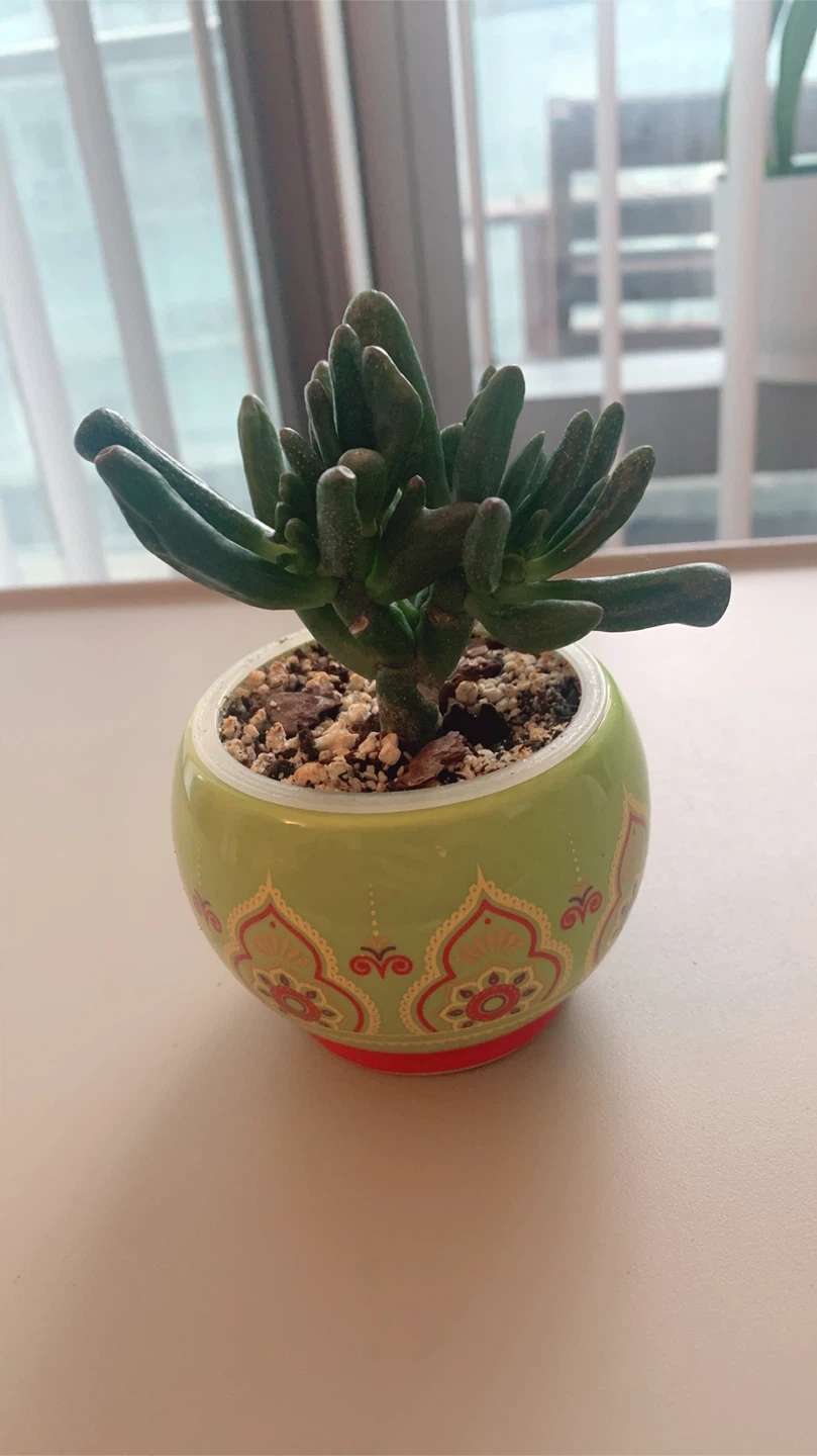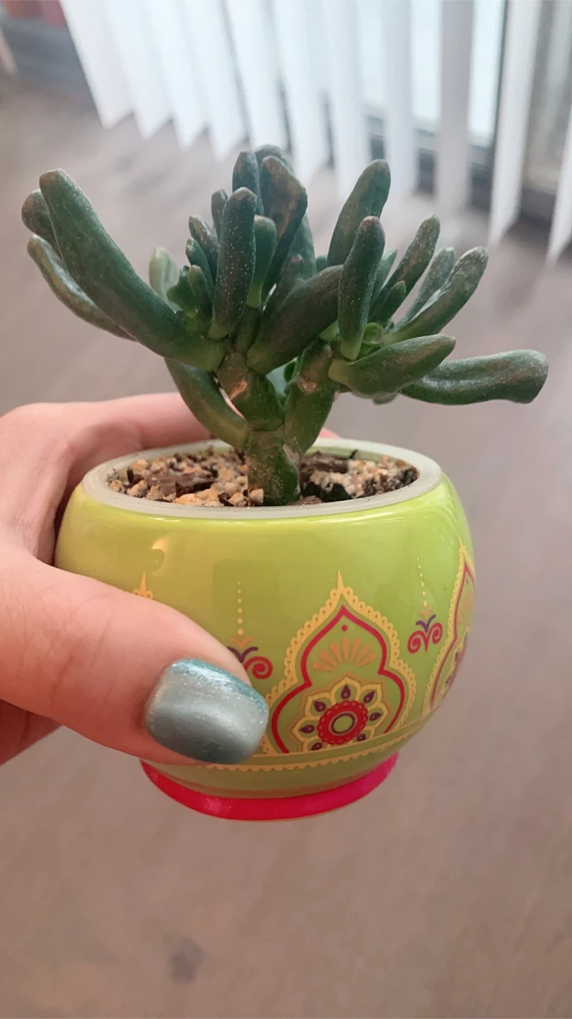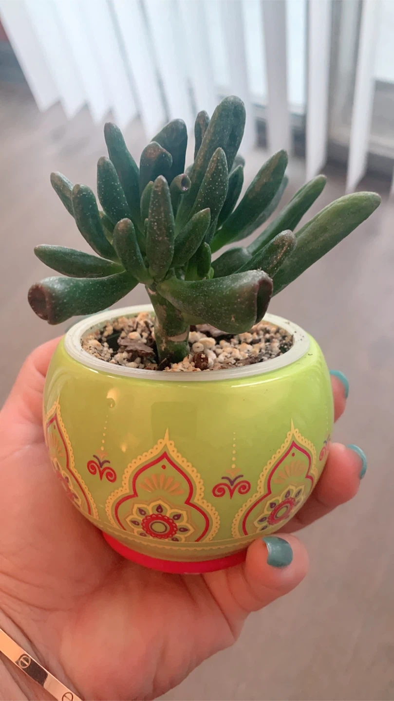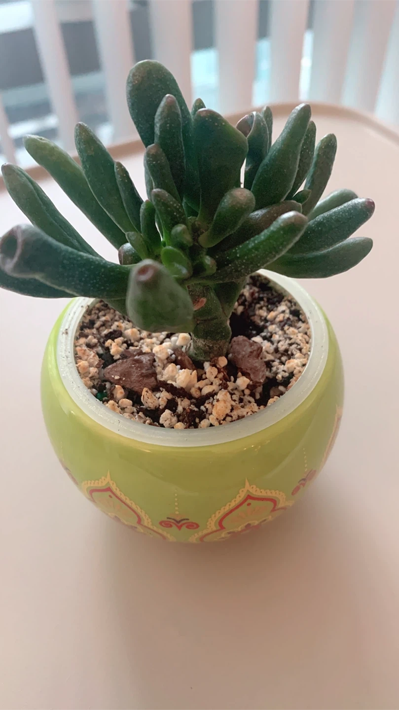 A cute little succulent plant in a decorative pot! It's perfect for adding a touch of green to any space.