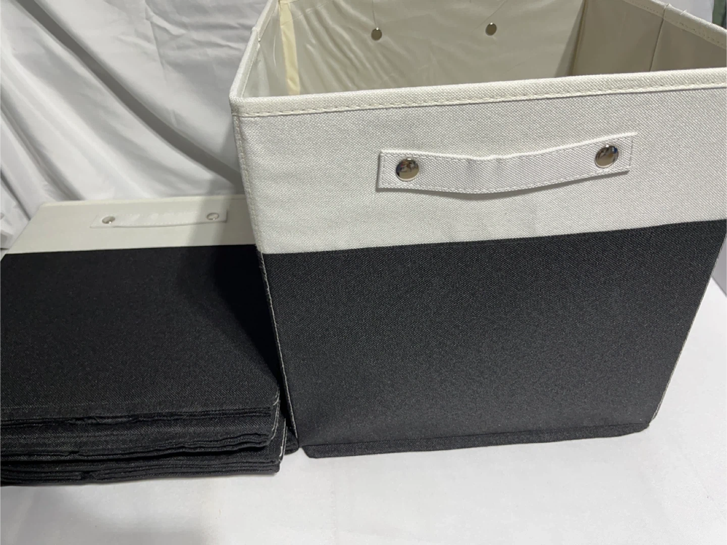 Selling a set of 6 storage bins in great condition! These are perfect for organizing your closet, shelves, or any space that needs a little tidying up. The bins are a stylish black and white colour, and they come with lids to keep your items dust-free. They're a good size for storing clothes, toys, or other household items.
