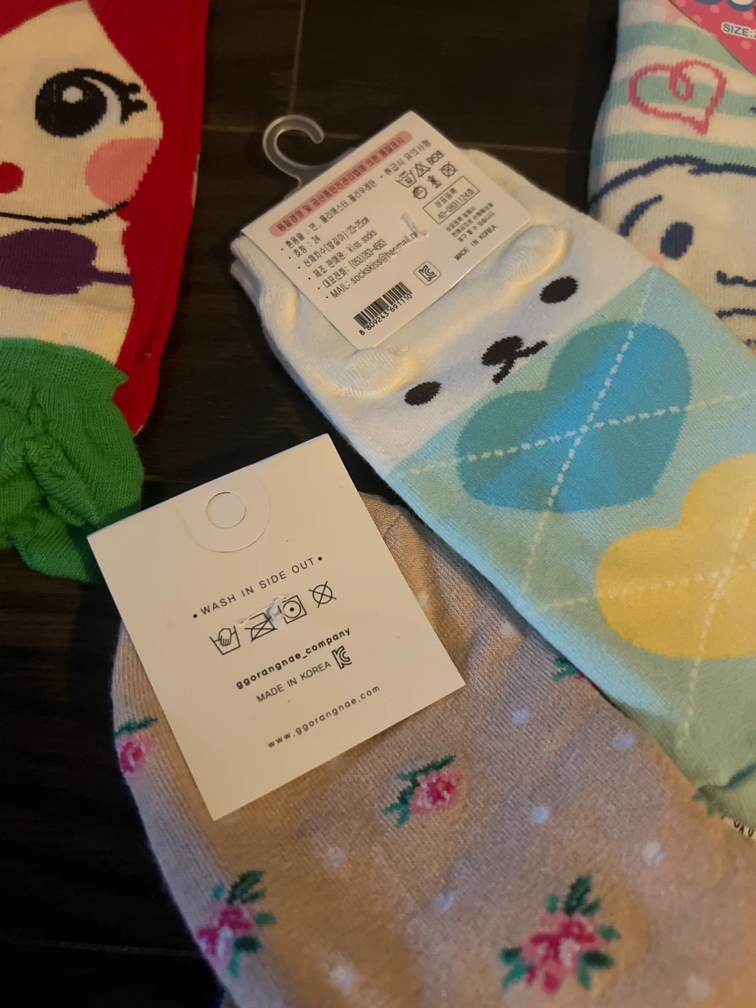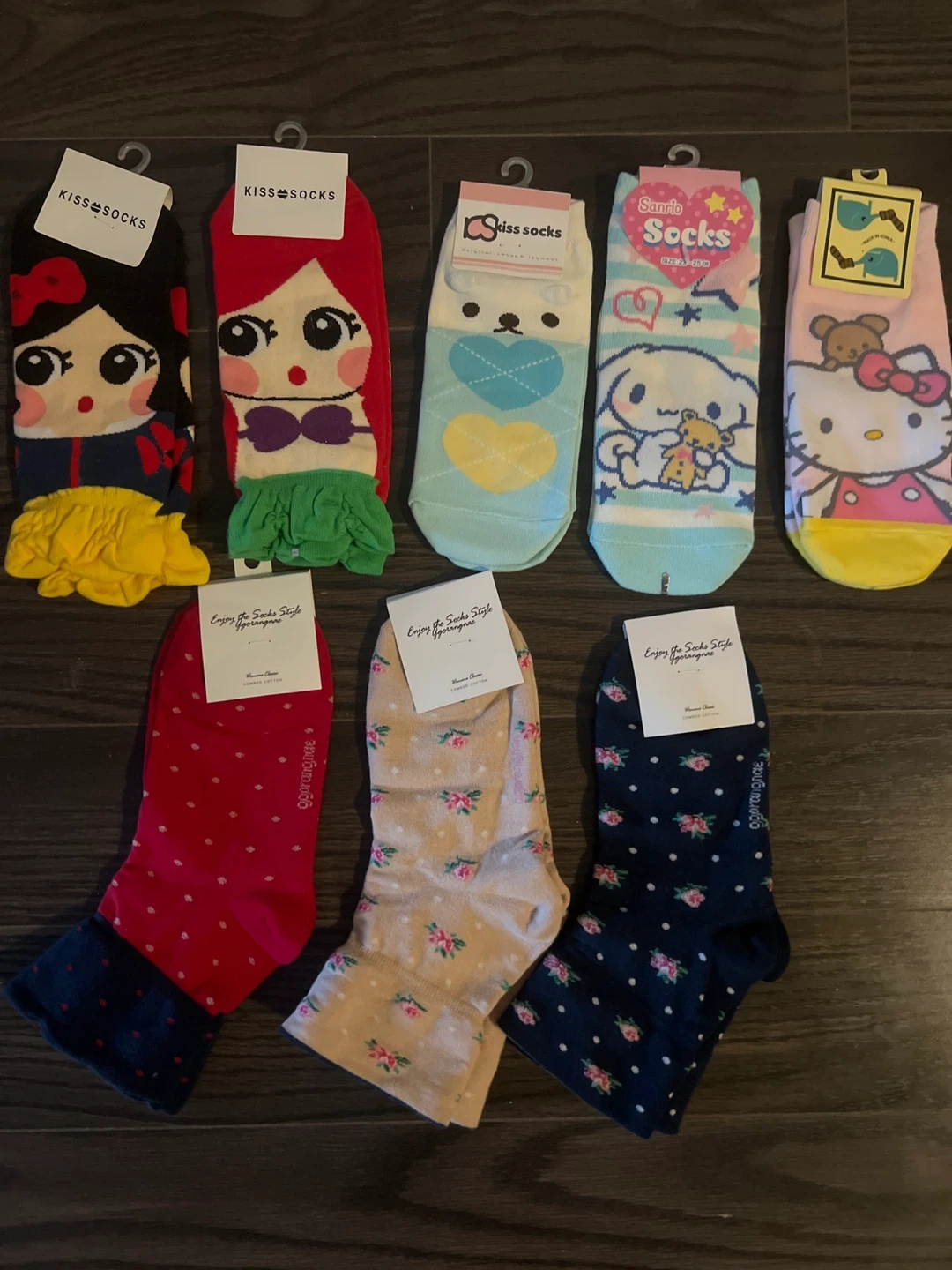 Selling a variety of cute socks! There are Kiss Socks with Snow White and Ariel designs, plus Sanrio socks featuring Cinnamoroll and Hello Kitty. Also included are some adorable floral-patterned socks from Ggorangnae. All are in great condition and ready to keep your feet cozy!