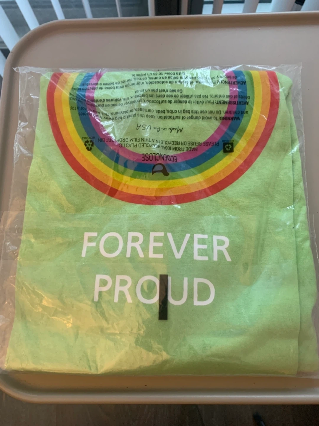 I have an ATC The Authentic T-Shirt Company Everyday Cotton tee for sale! It's a light green colour with a cute rainbow design and says 'Forever Proud'. Size is L/G.