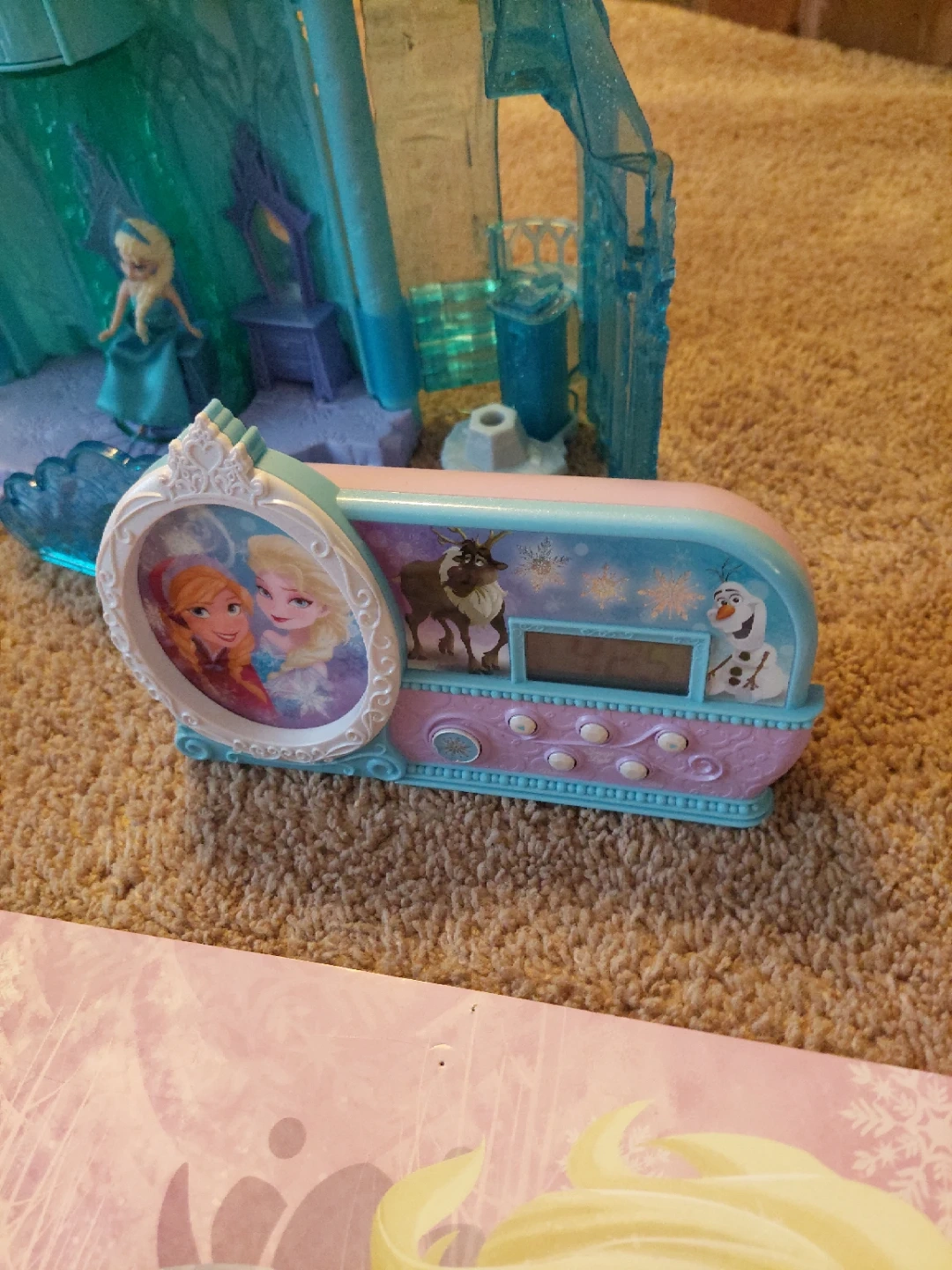 Selling a Frozen-themed lot! Includes a castle playset, a cute little bag, an alarm clock, and a poster featuring Anna and Elsa. Perfect for any Frozen fan!