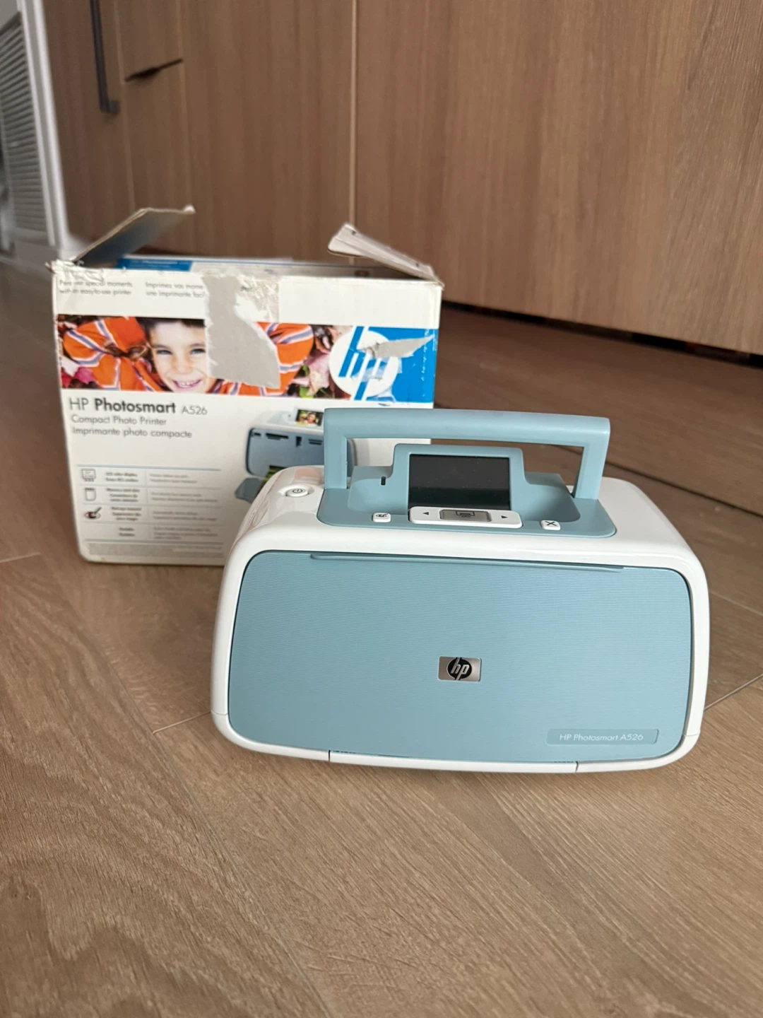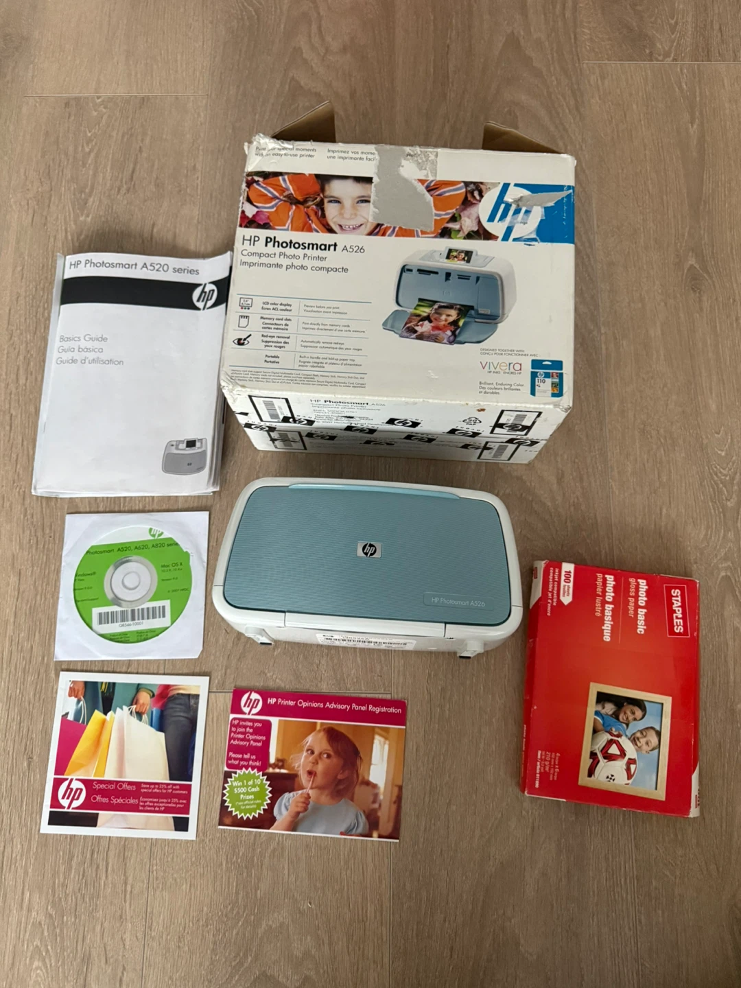 Selling a used HP Photosmart A526 compact photo printer! It comes with the original box and some accessories, including a basics guide, a driver CD, and some photo paper from Staples. Perfect for printing photos at home! The retail price for only the printer is around 200-250 CAD so i kept the price as down as possibly.