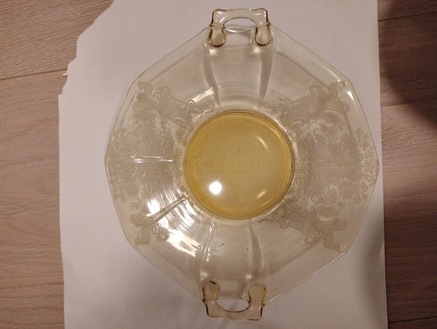 Selling a lovely vintage yellow depression glass plate It features a unique octagonal shape with handles and a beautiful floral etched design. It's in great condition and would make a wonderful addition to any collection or home decor