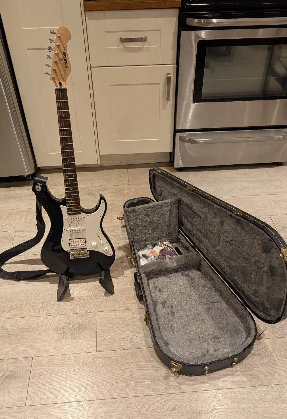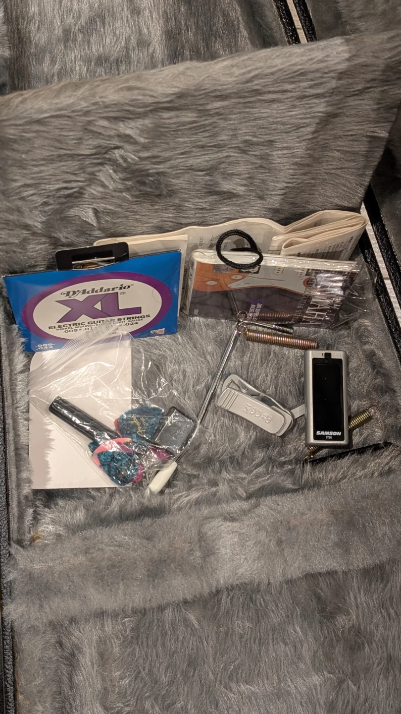 It comes with a hard tear drop case and some extras like guitar strings, picks, and a Samson tuner. Does NOT come with stand, amp or cables. Perfect for someone looking to start learning!