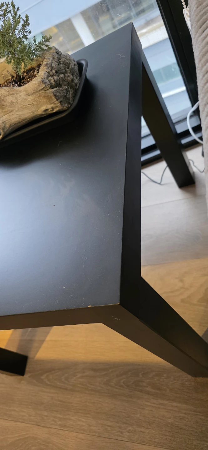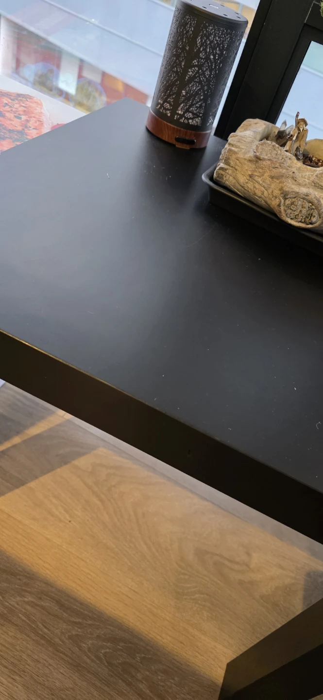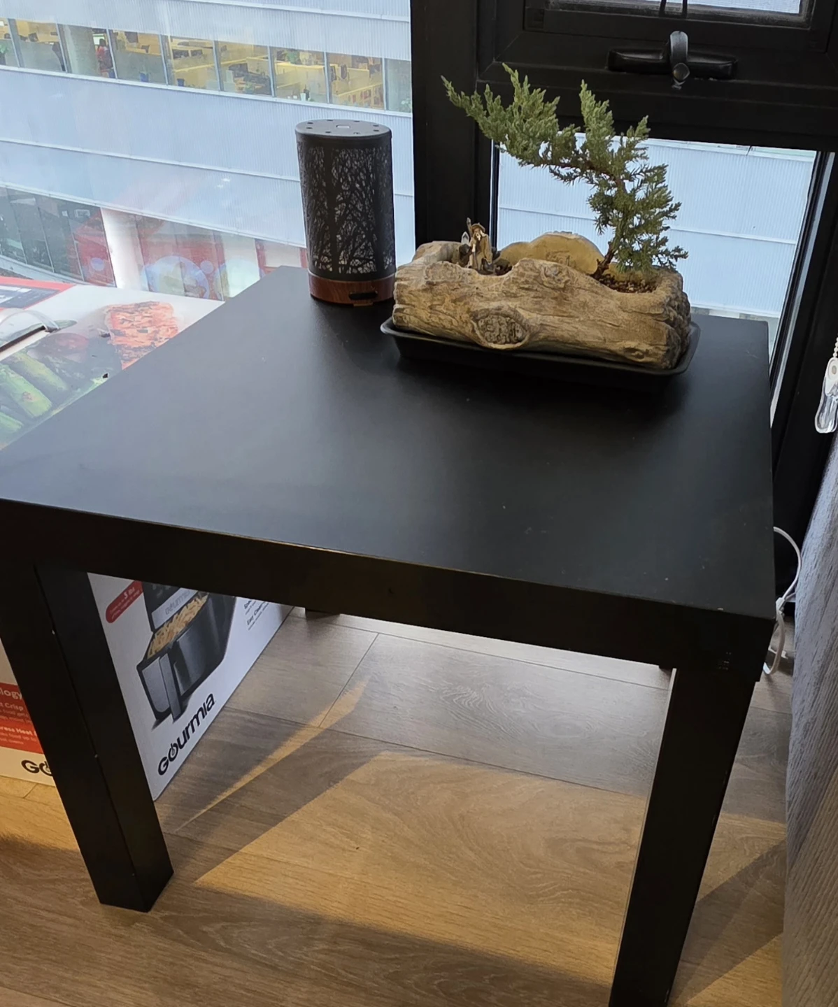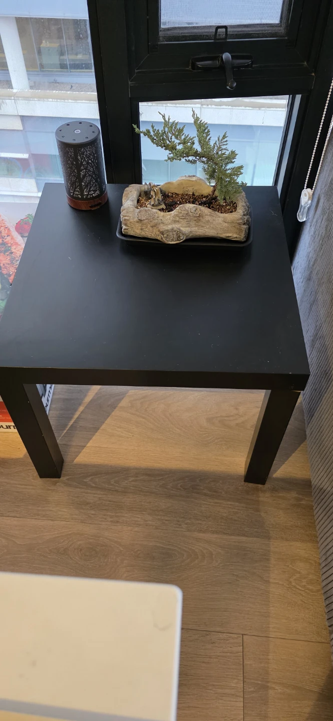 Selling a black side table in good condition. It's a simple, sturdy table that would work well in a living room, bedroom, or as a plant stand. Has a few minor scratches.