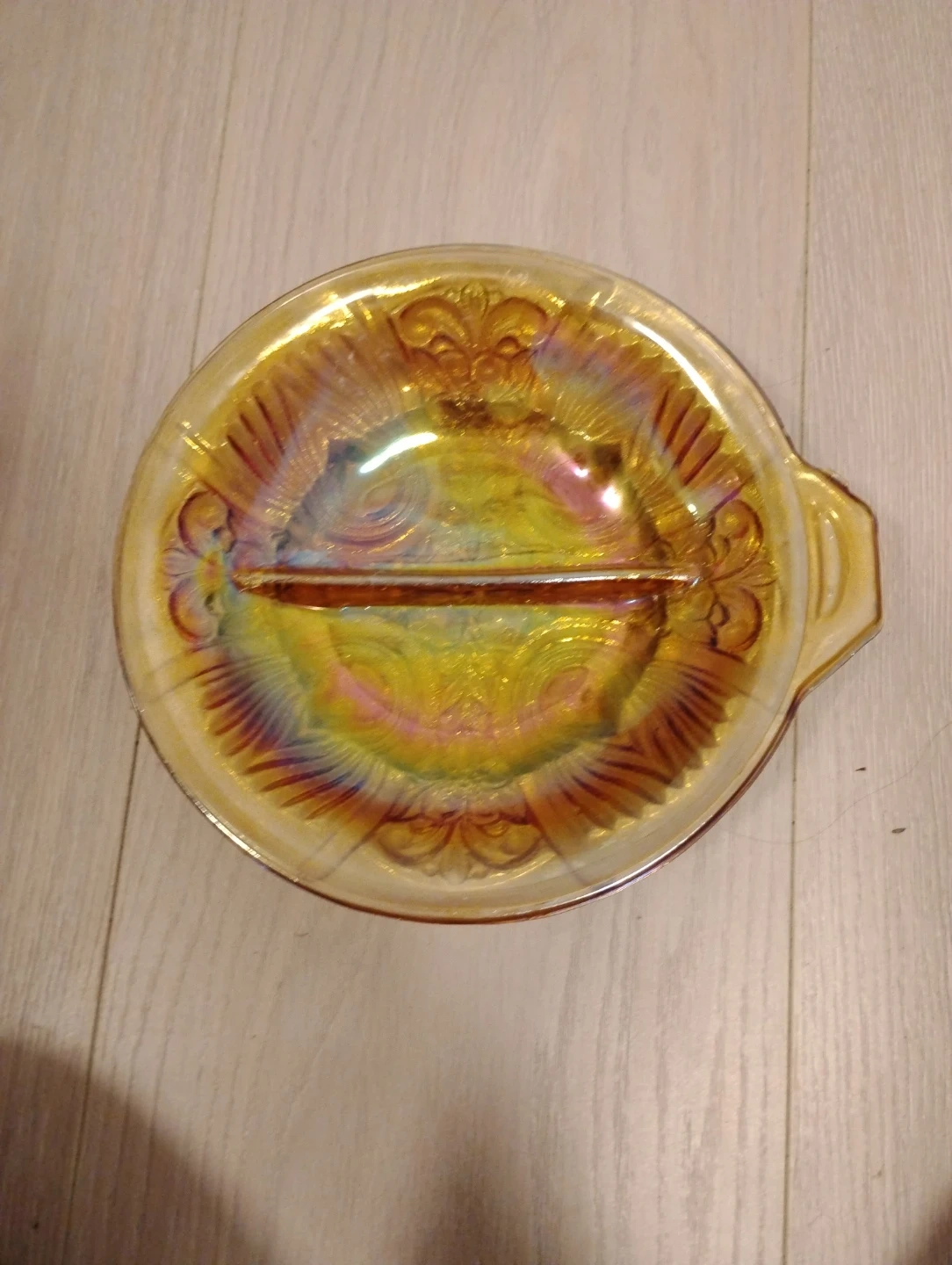 Selling a beautiful vintage carnival glass serving dish. It has a lovely iridescent sheen and intricate detailing. Perfect for adding a touch of vintage charm to your home!