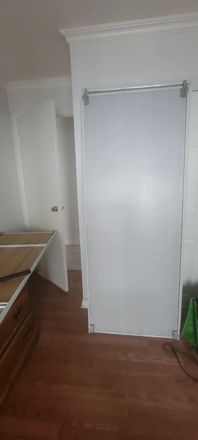 Selling a sliding wardrobe door that comes with all the necessary hardware. It's in good condition and ready to be installed in your home. 50dollars for each pair size are high 78x24.5 and 78x31 mirror roller top and bottom are 49 and 57