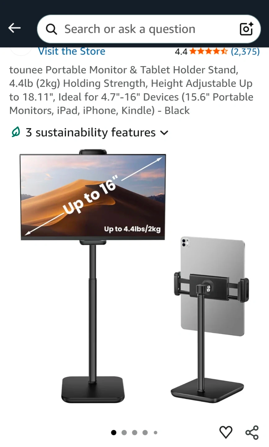 Selling a Tounee portable monitor and tablet holder stand. It's black and can hold devices from 4.7" to 16". It can hold up to 4.4lbs (2kg) and is height adjustable up to 18.11".