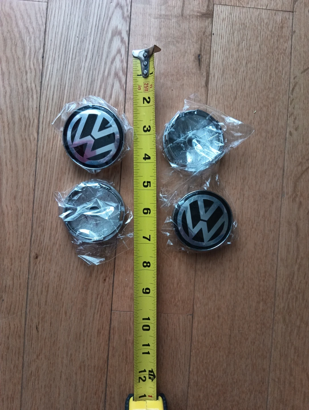 Selling a set of four Volkswagen wheel center caps. They are new and still in their original packaging. The diameter is approximately 65 mm. Perfect for replacing lost or damaged caps!