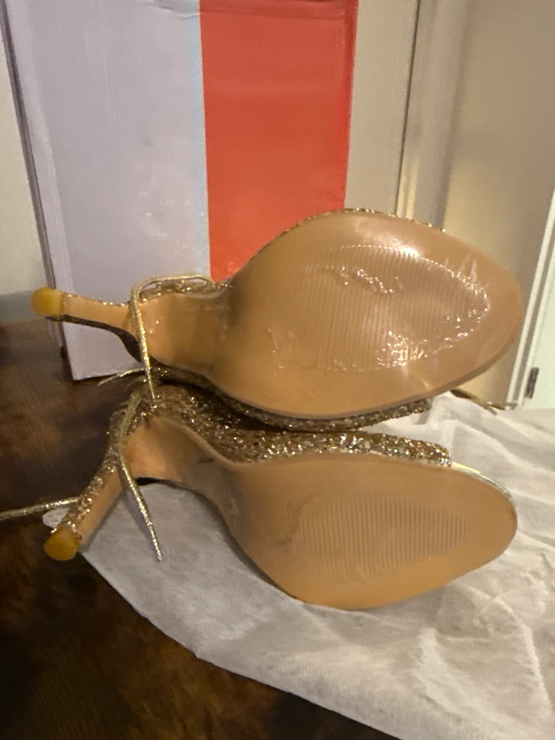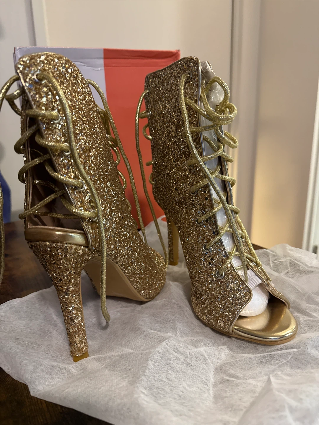 Gorgeous gold glitter lace-up heels in a size 39 ! These heels are perfect for a night out or a special occasion. They add a touch of sparkle to any outfit and are sure to turn heads