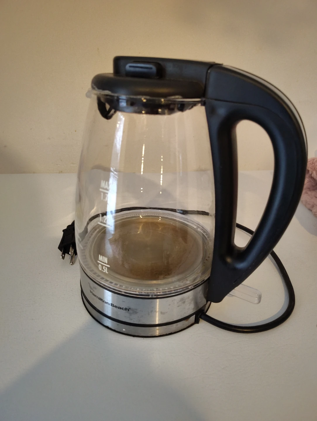 Selling a Hamilton Beach glass electric kettle. It's in good used condition and ready to heat up your water quickly! Perfect for tea, coffee, or instant noodles. A bit dirty but still good. Don't have the original box but can put it in a different box